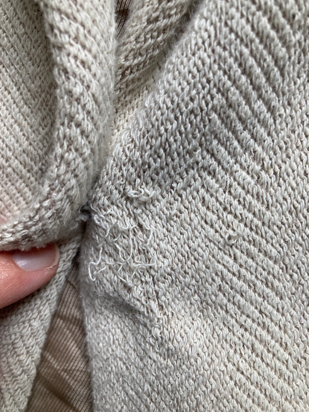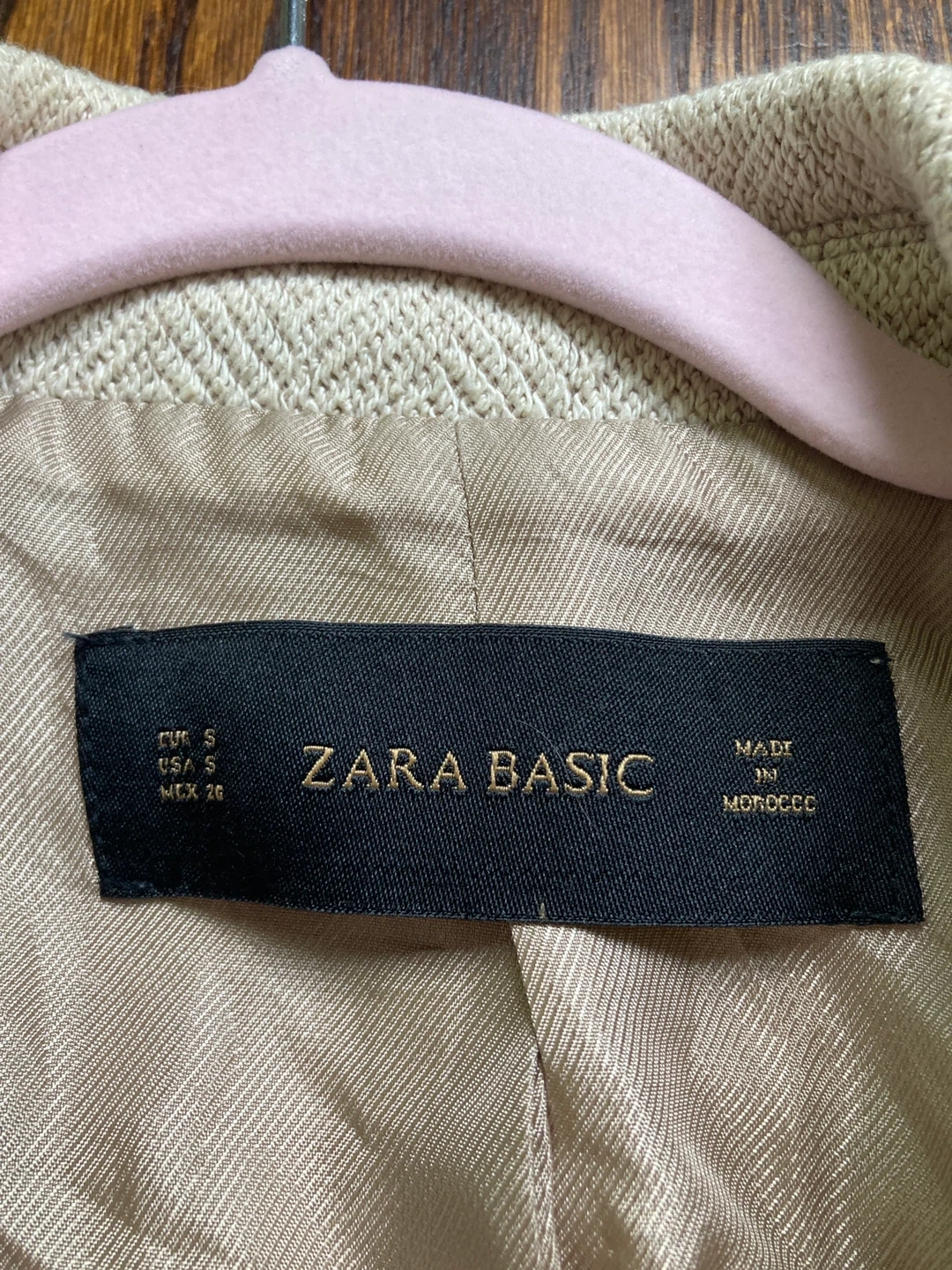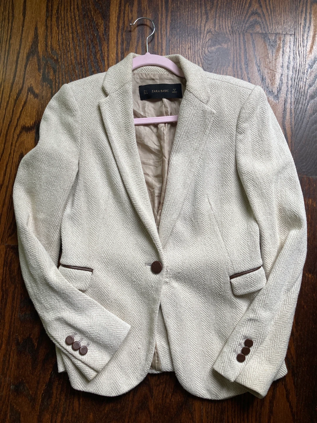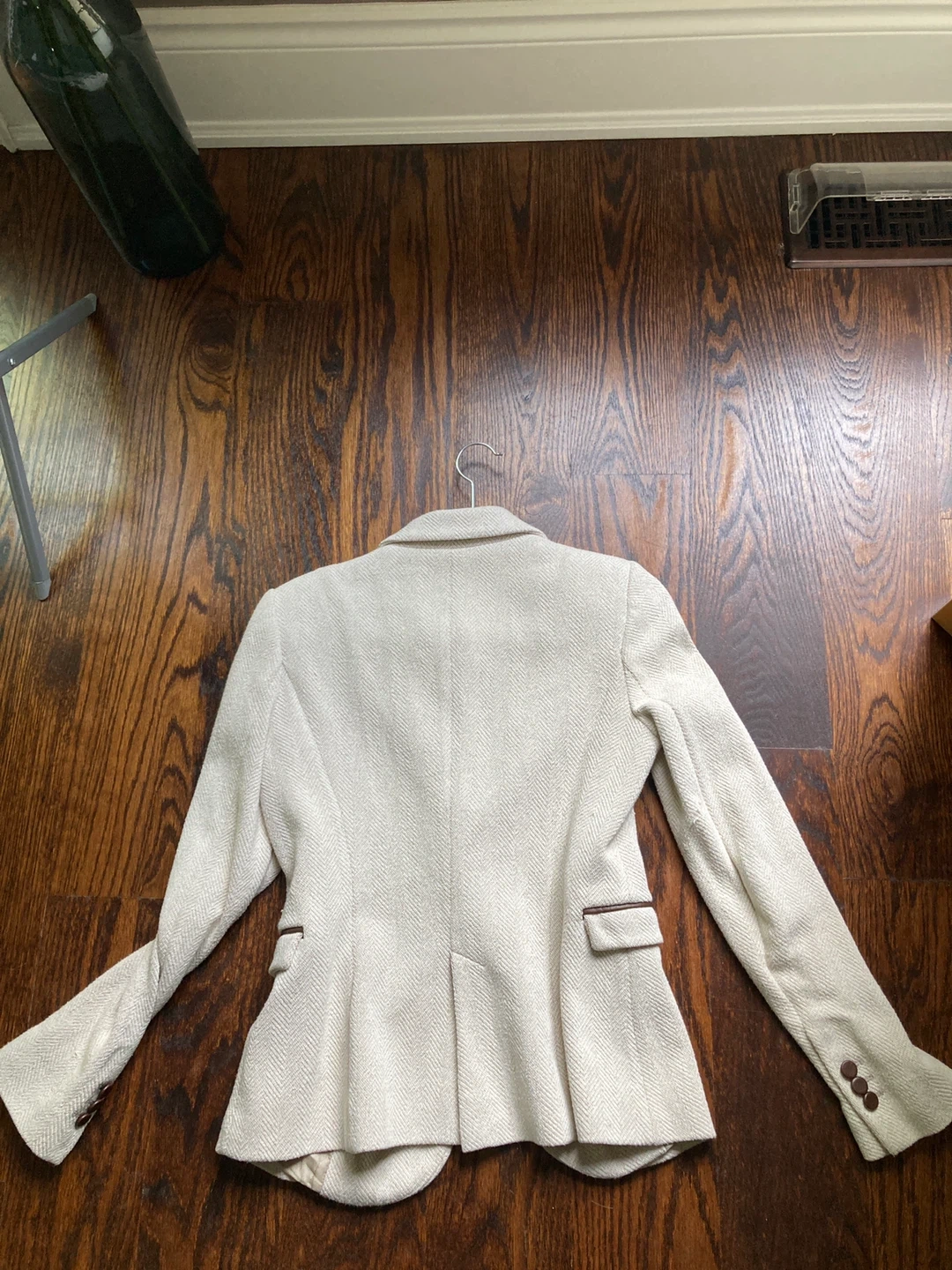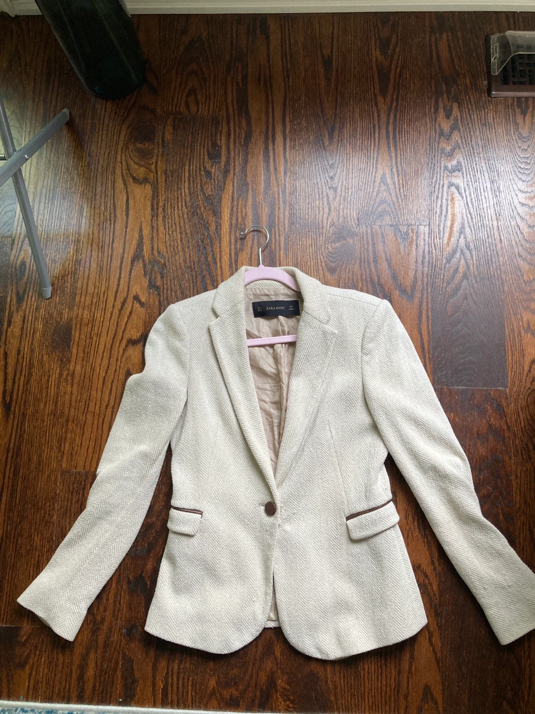 Cream coloured women’s blazer, size small. From Zara. Great for work. See photos for details. Some minor fraying underneath button. Cash only please. Pickup at Lululemon store, 2558 Yonge Street.