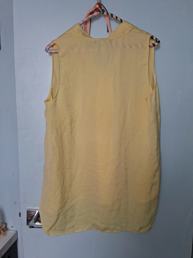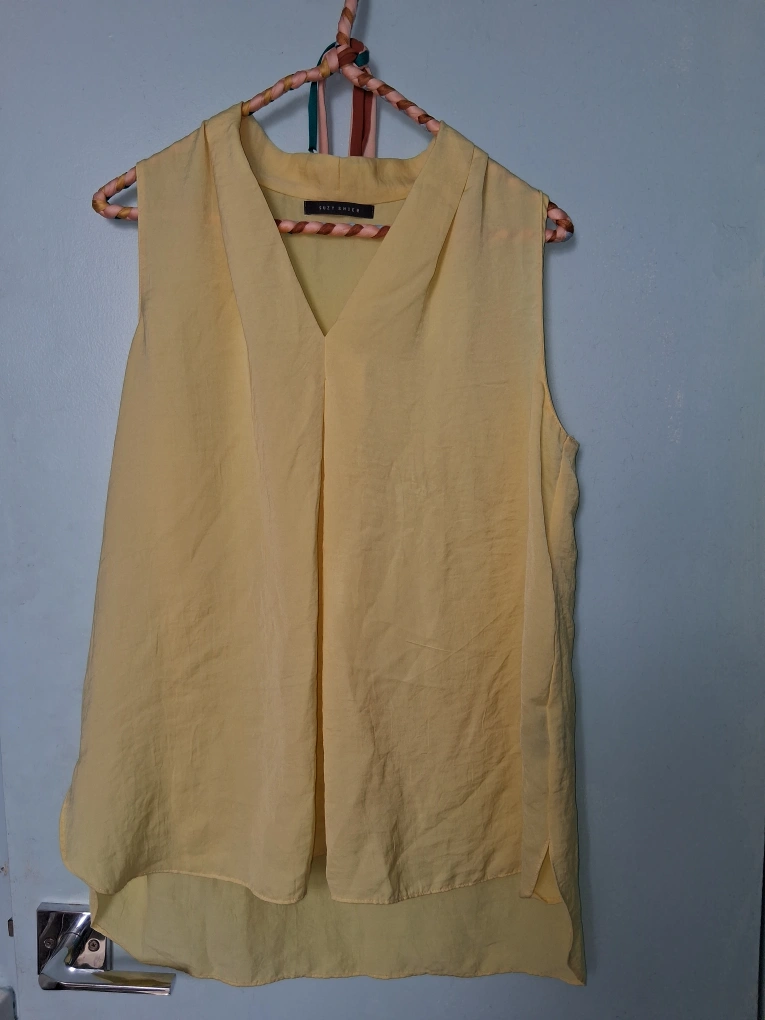 Here's a lovely yellow sleeveless blouse from Suzy Shier. It's perfect for warmer weather and can be dressed up or down. The colour is a soft yellow, and it's made from a comfortable material. It's in great condition and ready for a new home!
