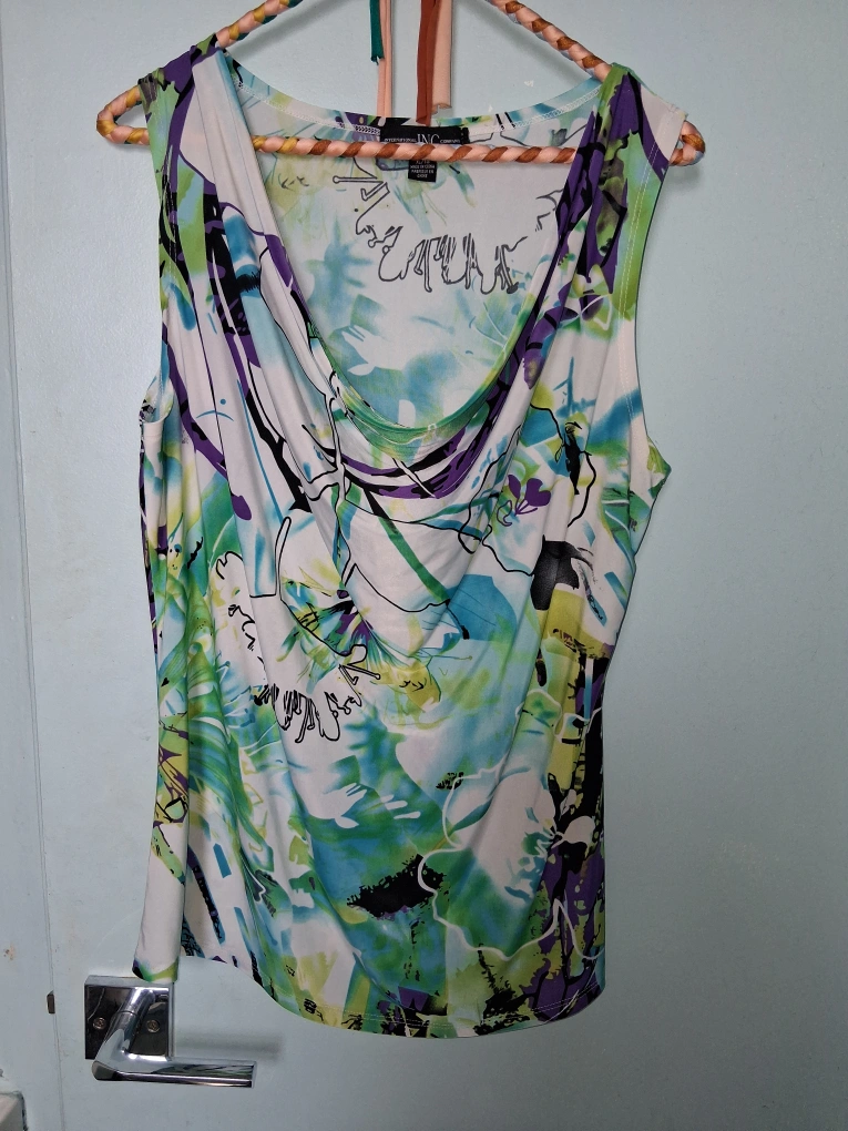 This INC International Concepts sleeveless top is a size XL. It features a colourful abstract pattern in shades of blue, green, purple, and black on a white background. The material feels soft and stretchy, perfect for a comfortable fit!