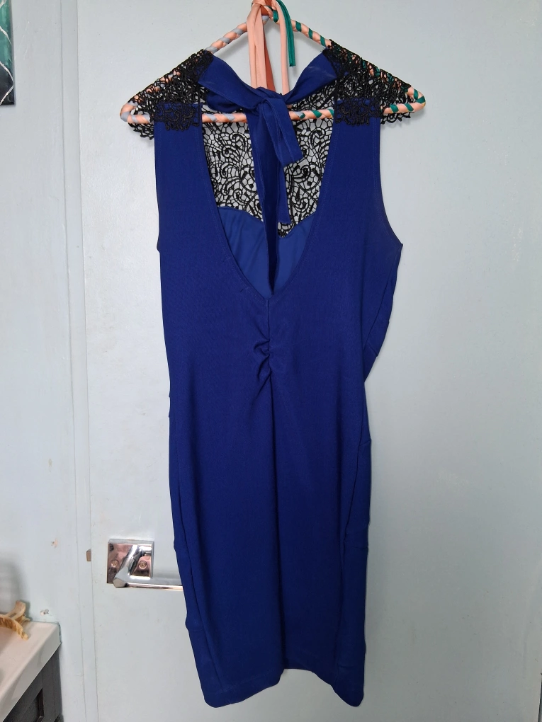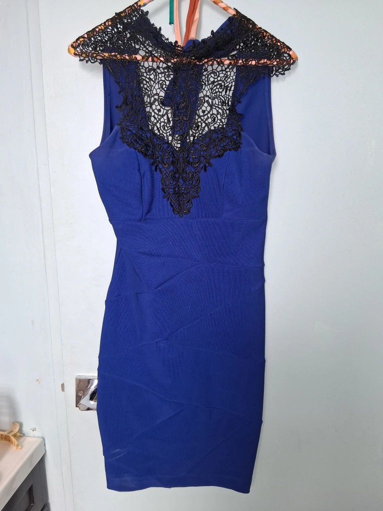 This is a beautiful blue dress from Le Chateau. It features a black lace detail around the neckline. The dress is a size M/M.