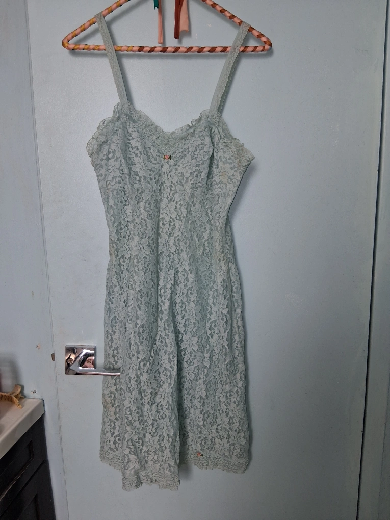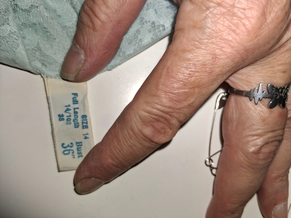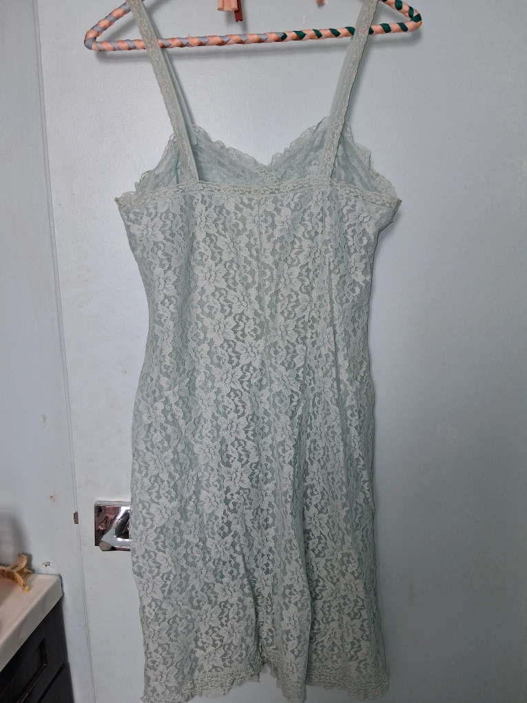 Here's a lovely St Michael lingerie slip dress! It's a full-length design in size 14, with a bust size of 36". The dress features delicate lace detailing and is perfect as a nightgown or underdress
