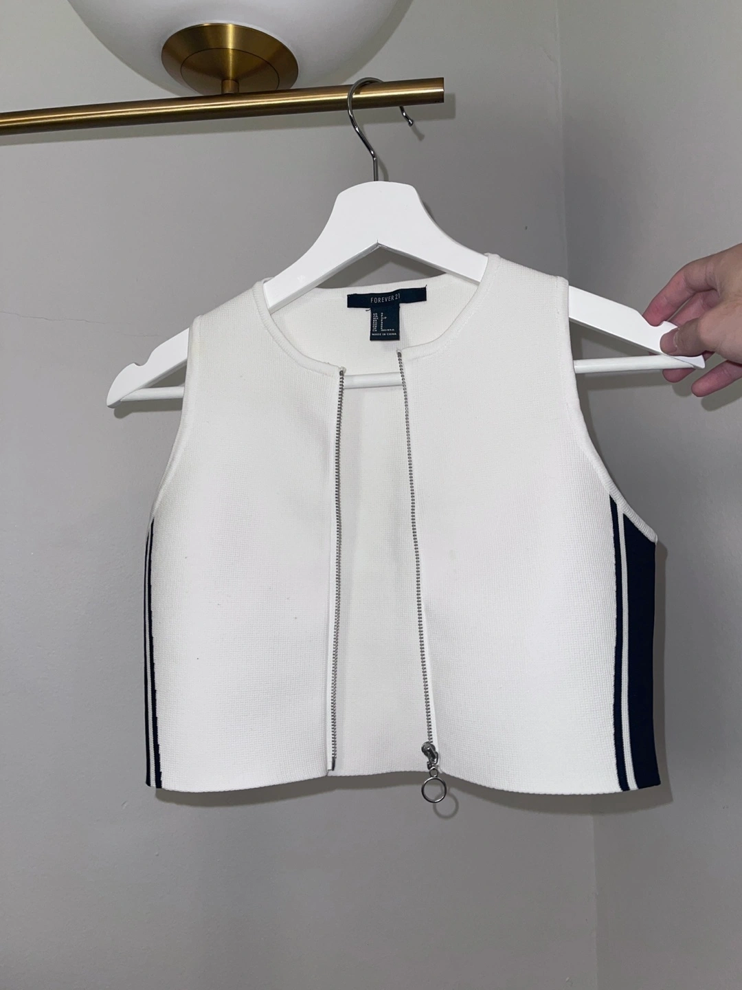 Cute Forever 21 crop top in size small. It's white with black accents on the sides and a zipper in the front. Perfect for having an elegant but cool style. I don’t get around to wearing it much.