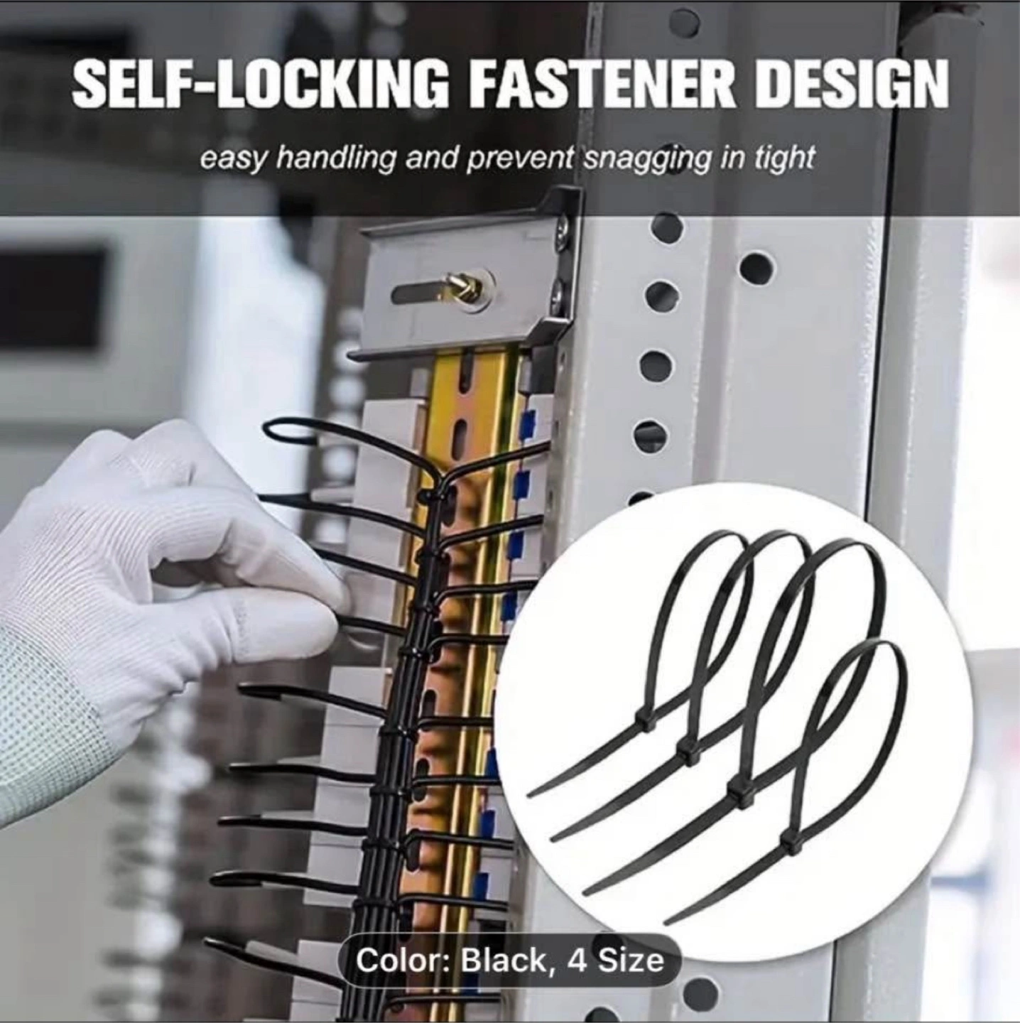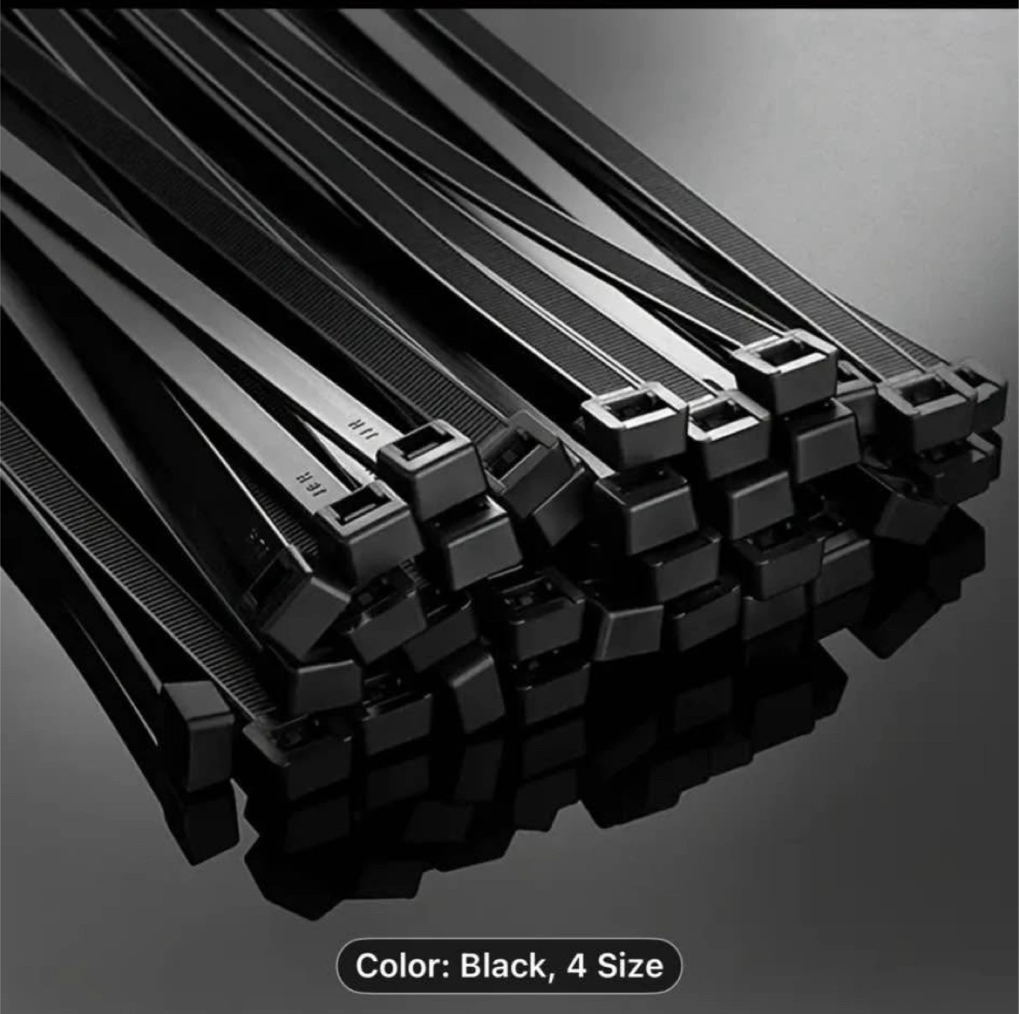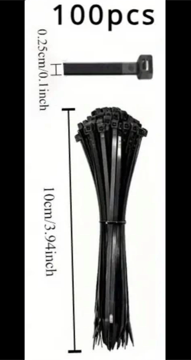 I'm selling a set of 100 black cable zip ties. They are 4 inches in size. These are great for organizing cables or any other project where you need to bundle things together. They feature a self-locking fastener design for easy handling and to prevent snagging in tight spaces