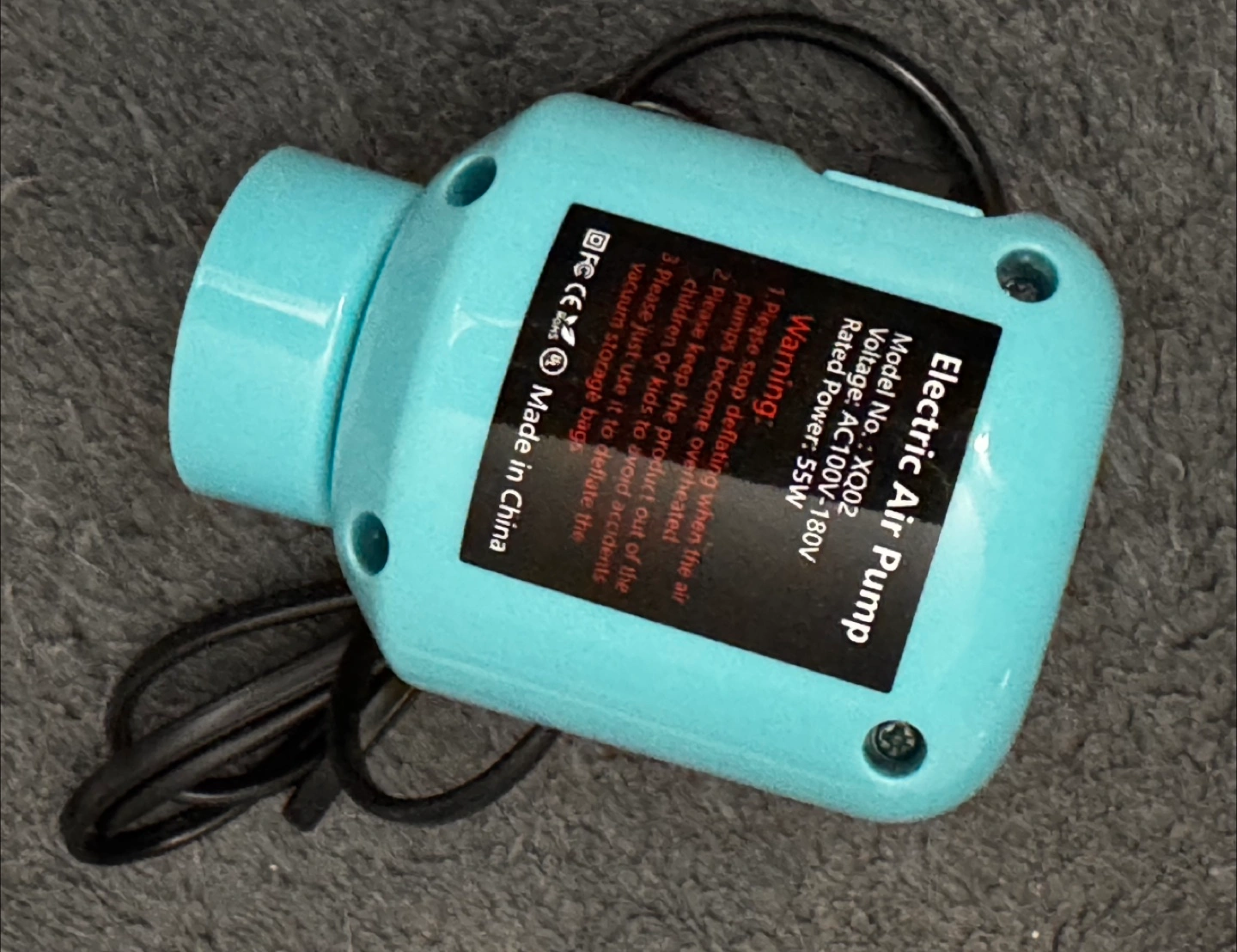 Selling an electric air pump, model XQ02. It operates at AC100V-180V with a rated power of 55W. Please remember to stop deflating when the pump overheats and keep it away from children. It's designed for deflating vacuum storage bags