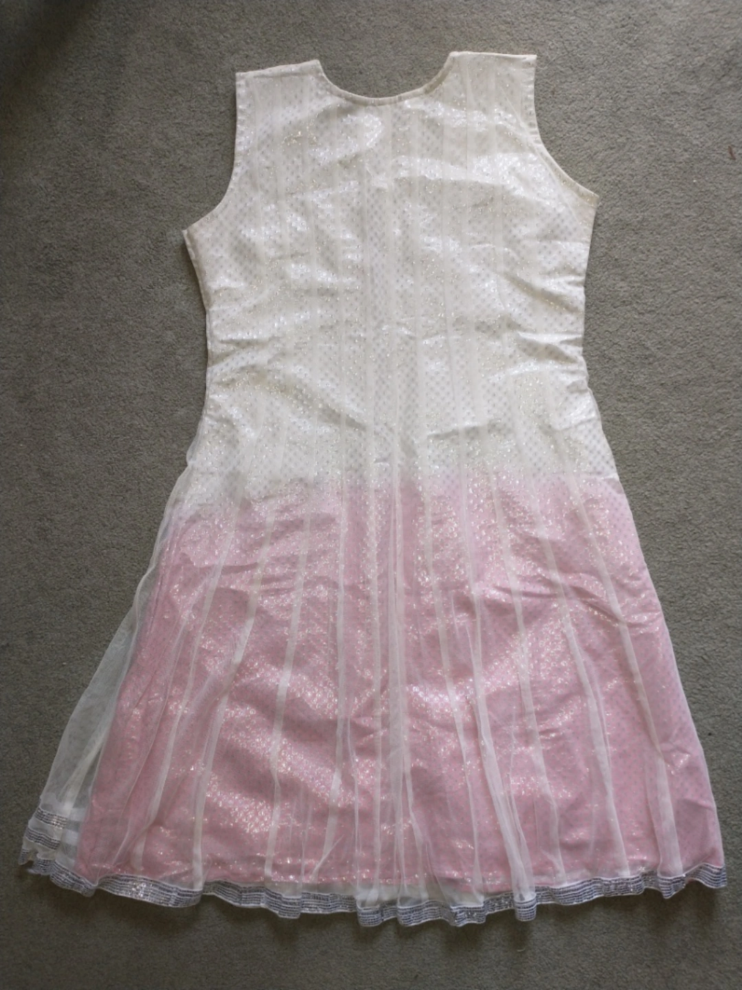 A beautiful fancy dress in a lovely white and pink colour gradient. It features intricate embellishments around the neckline and hem, adding a touch of sparkle and elegance. Perfect for special occasions or dressing up! Measures 40" from top to bottom. Comes with a matching scarf/shawl. I can meet at Nanaimo Skytrain Station (every day) or in Coquitlam at Lafarge Lake/Douglas College Skytrain Station (Mon and Fri).