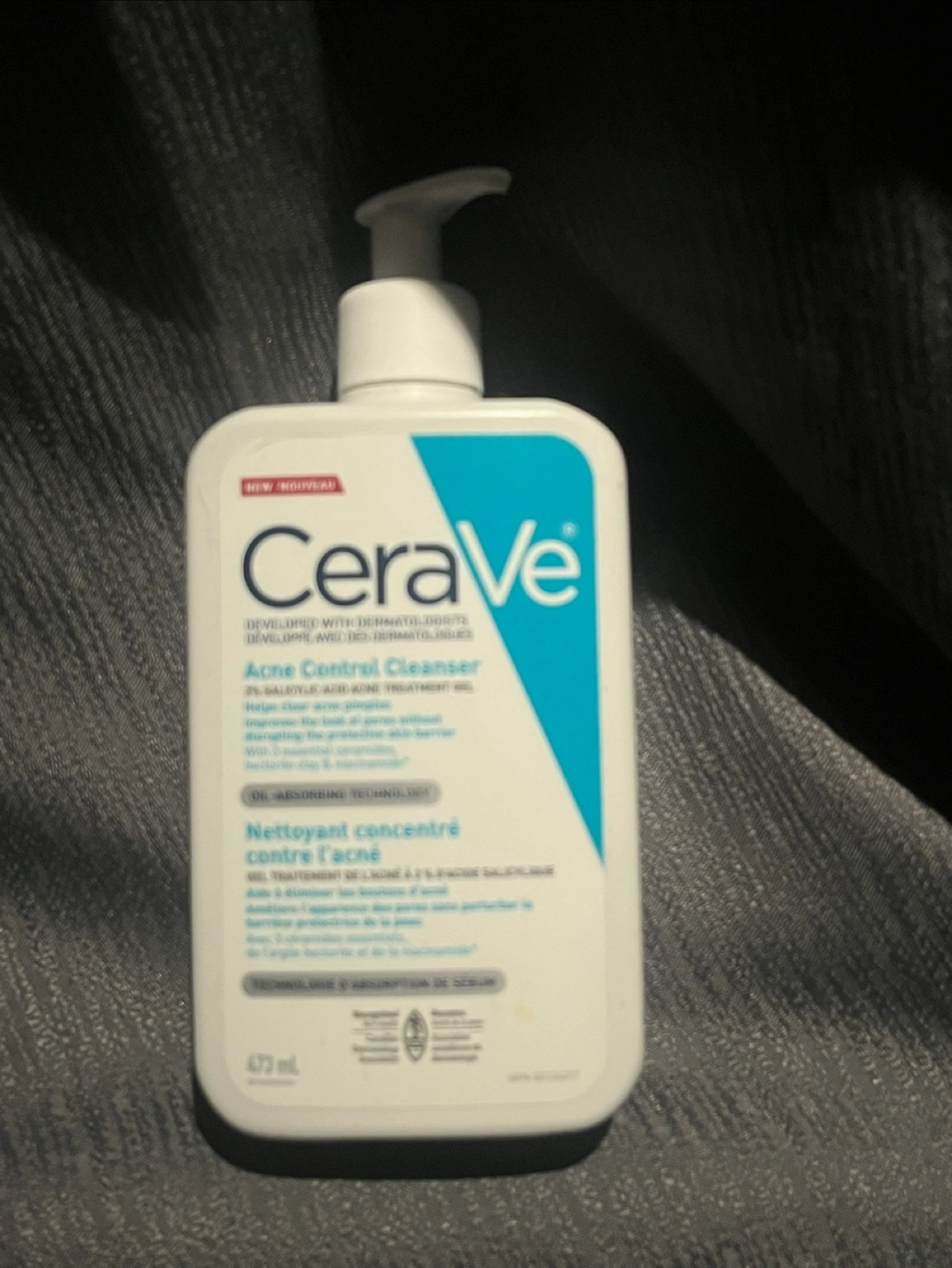 I'm selling a CeraVe Acne Control Cleanser in a 473 mL bottle. It's a salicylic acid acne treatment gel cleanser developed with dermatologists. The expiration date is July 2026