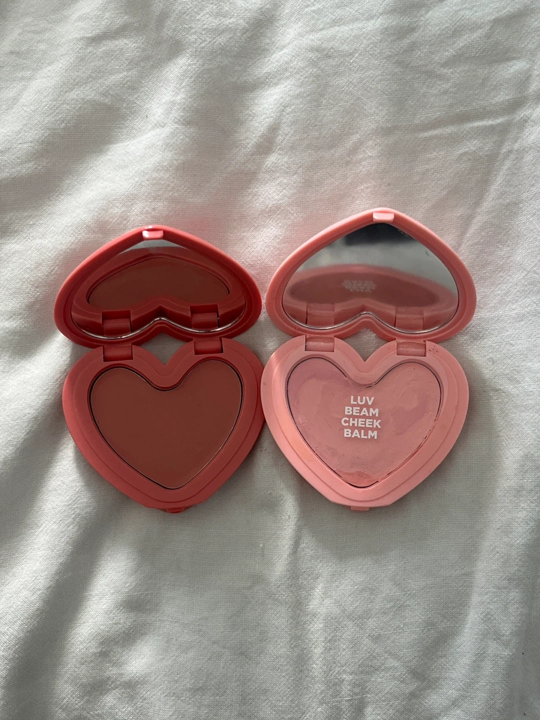 Selling a set of lilybyred Luv Beam Cheek Balms! These heart-shaped blushes are super cute and add a lovely pop of colour to your cheeks. One is in shade #03 and the other is a lighter pink shade. They're in great condition and ready for a new home Selling left one for $7 and right one for $4