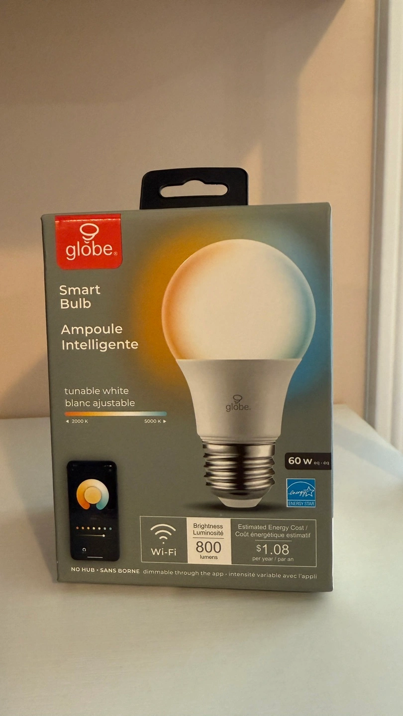 Selling a Globe Smart Bulb that's tunable white! It's a 60W equivalent and produces 800 lumens of brightness. It's Wi-Fi enabled, dimmable through the app, and doesn't require a hub. The box is included!