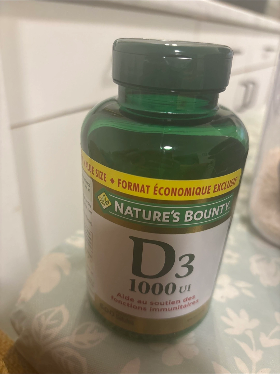 Selling a bottle of Nature's Bounty D3 1000 IU softgels. This value size bottle contains 600 softgels to help support immune function. Each softgel provides 1000 IU of Vitamin D3. Expiry date is 2027 April