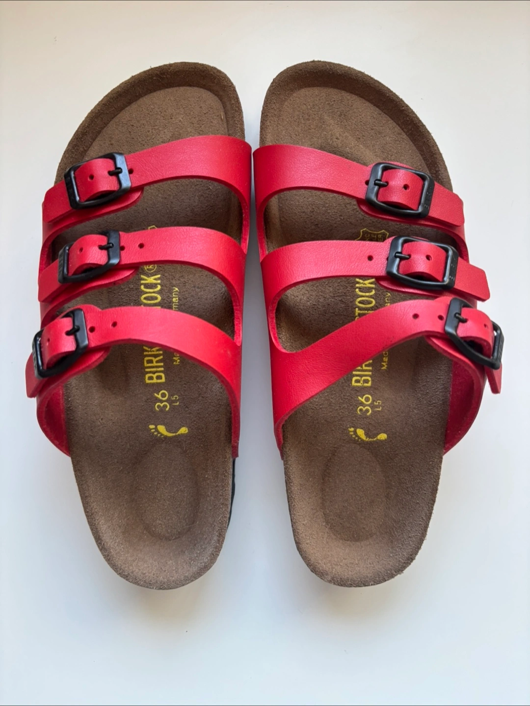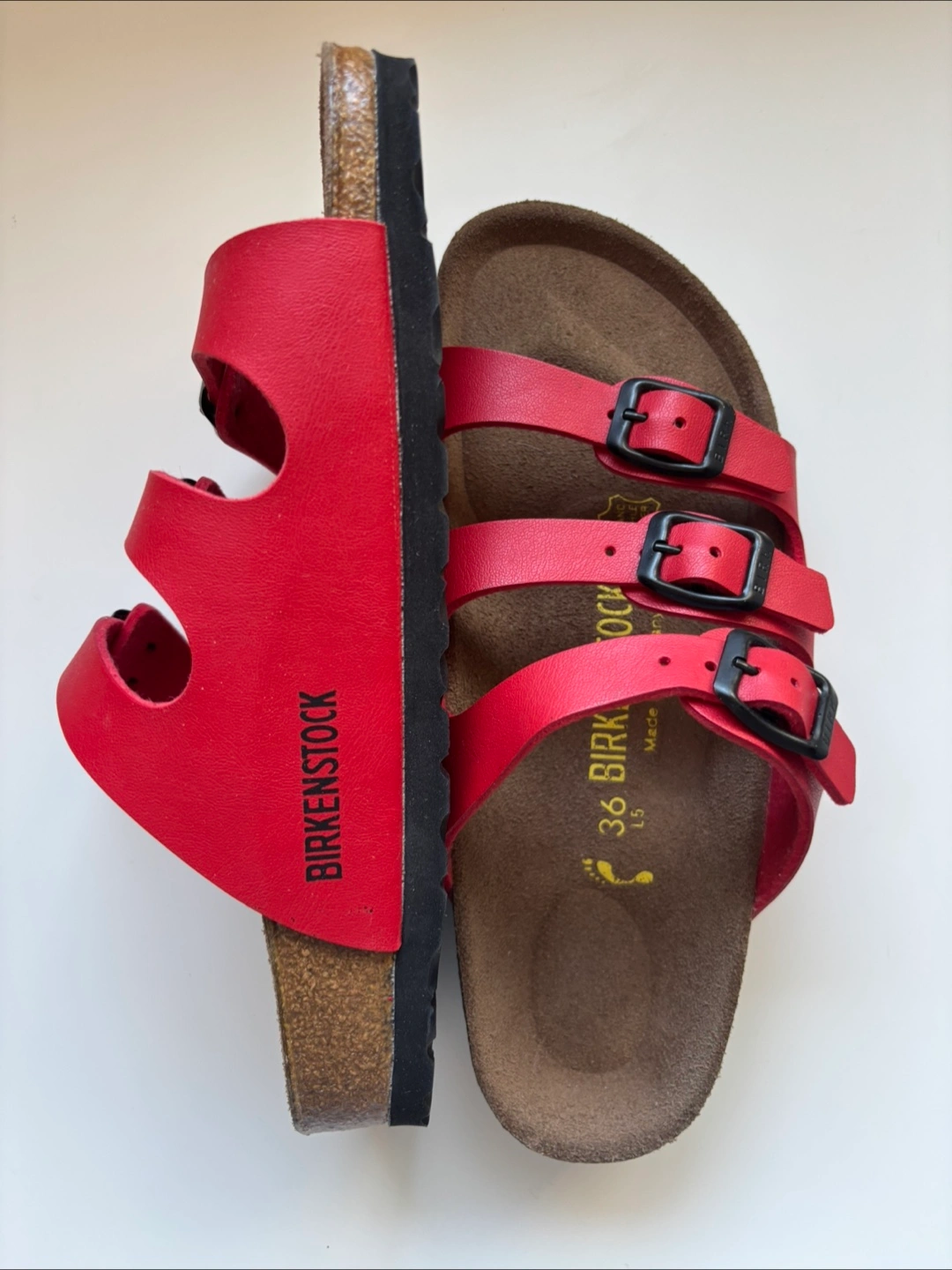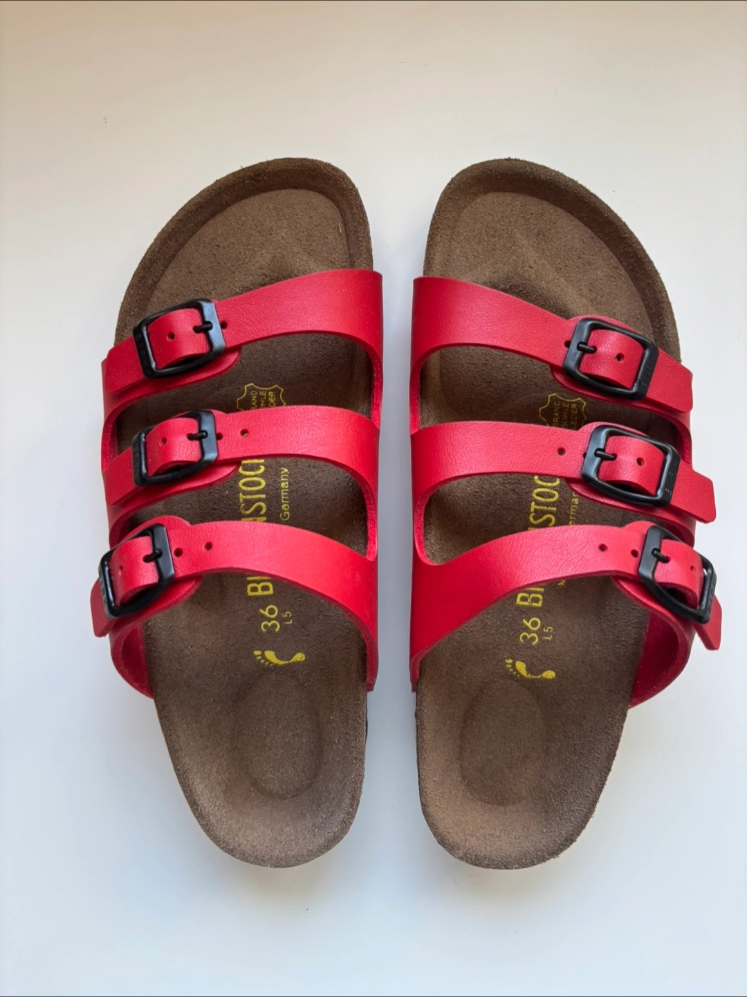 Selling a pair of Birkenstock Florida sandals in red. They are size 36. Comes with the original box! leather Brand new never worn.