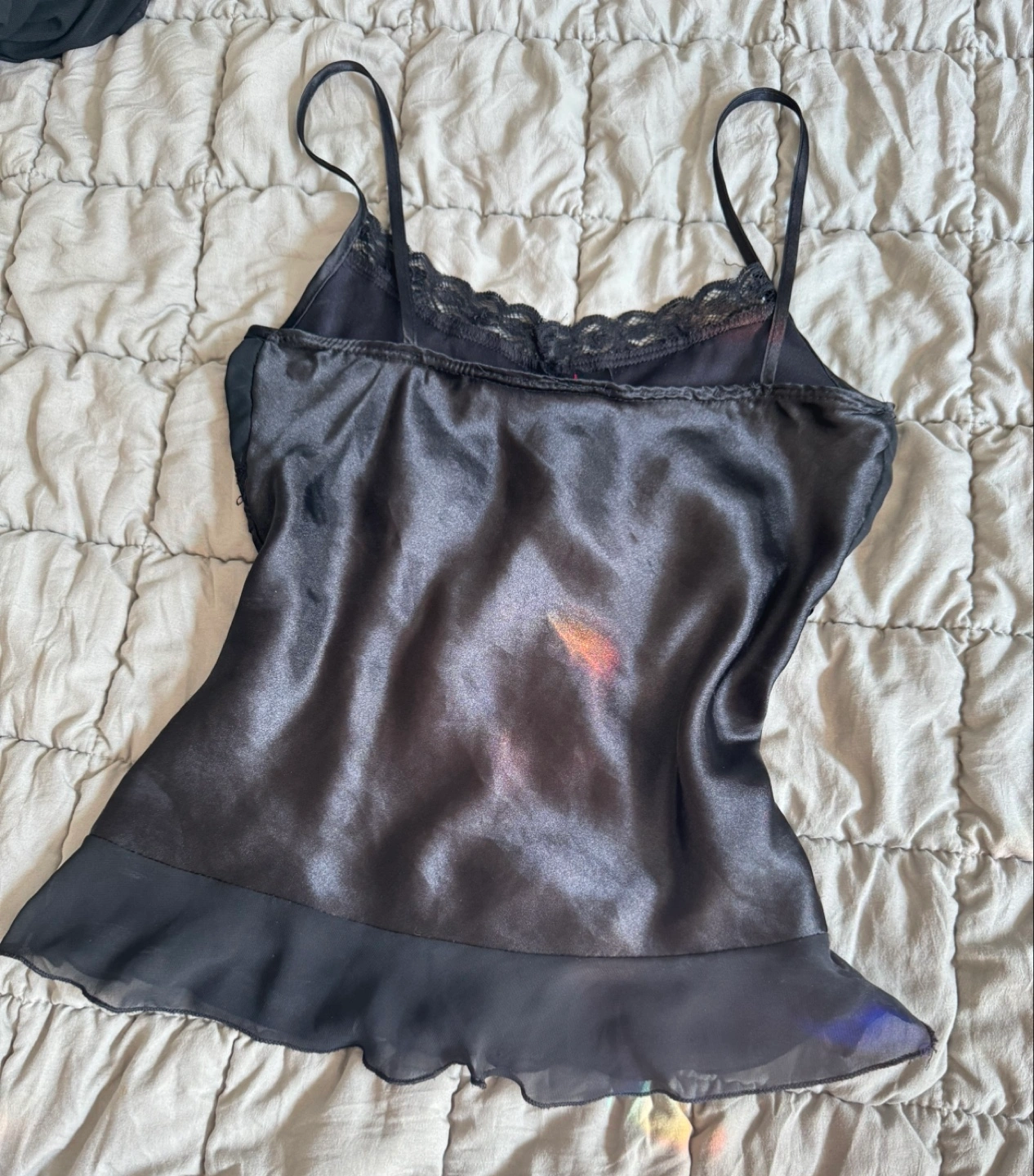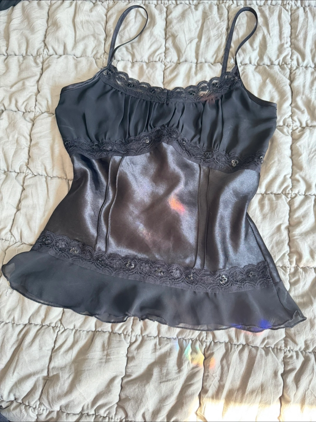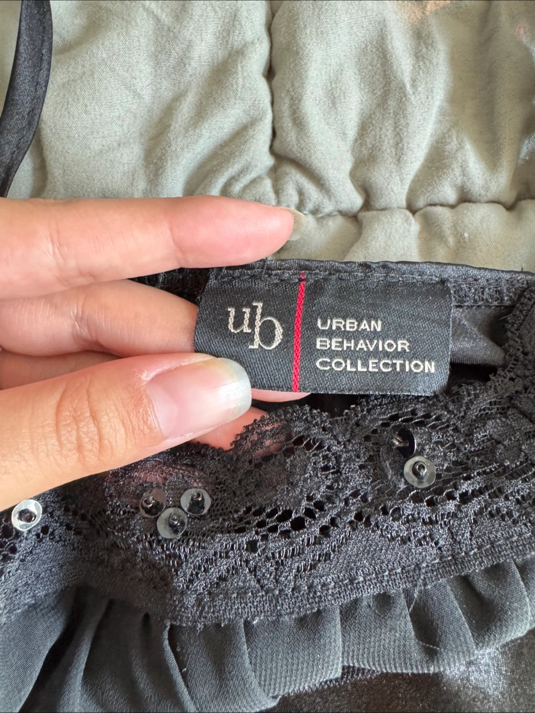 Black vintage top with lace & mesh detailing on the bottom. No size tag but it fits like an extra-small to small I do own a cat so cat fur might be visible
