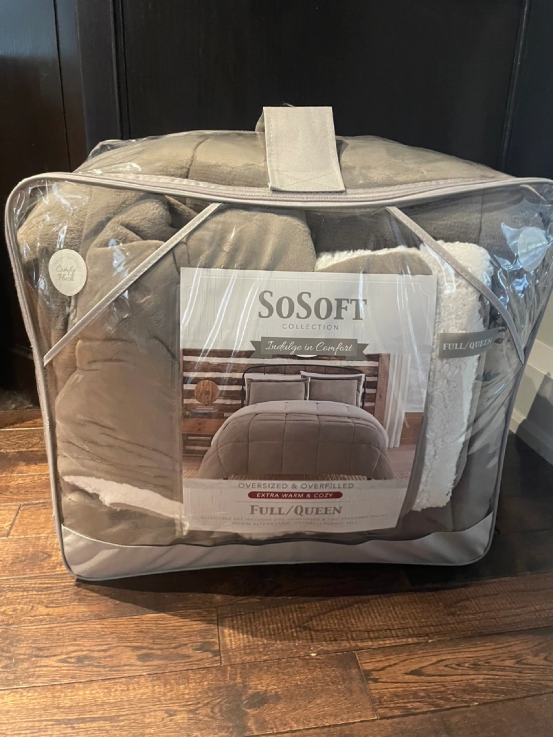 Snuggle up with this SoSoft Collection comforter set in full/queen size! It's oversized and overfilled for extra warmth and coziness. The soft material will make you want to stay in bed all day. Indulge in comfort with this lovely set! Never used. Just put on bed and taken off.