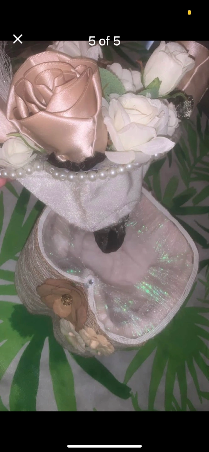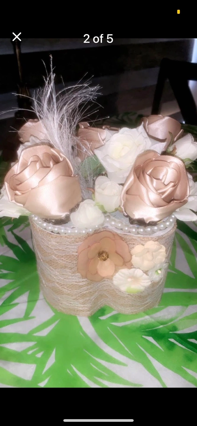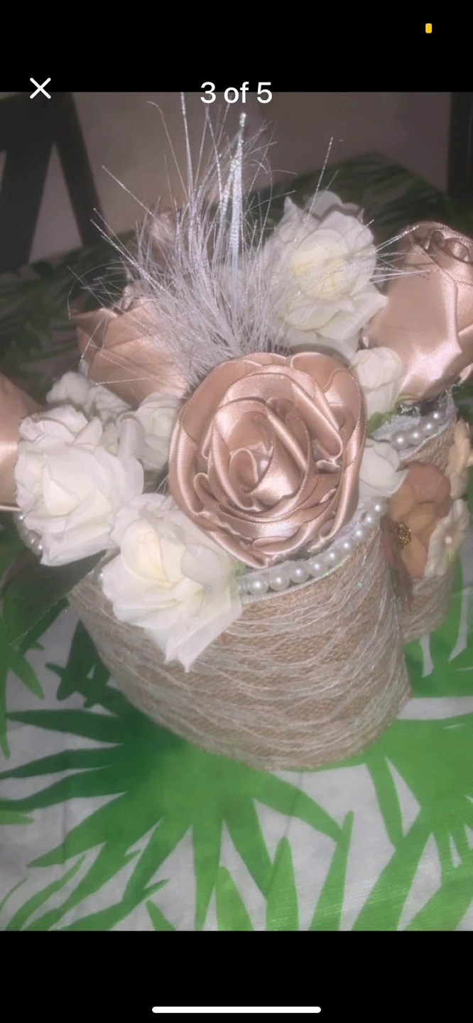 This is a beautiful decorative floral arrangement. It features a variety of flowers in neutral tones, including roses and other delicate blooms. The arrangement is set in a unique container wrapped with twine and adorned with pearl-like accents. It would be a lovely addition to any home decor little storage area