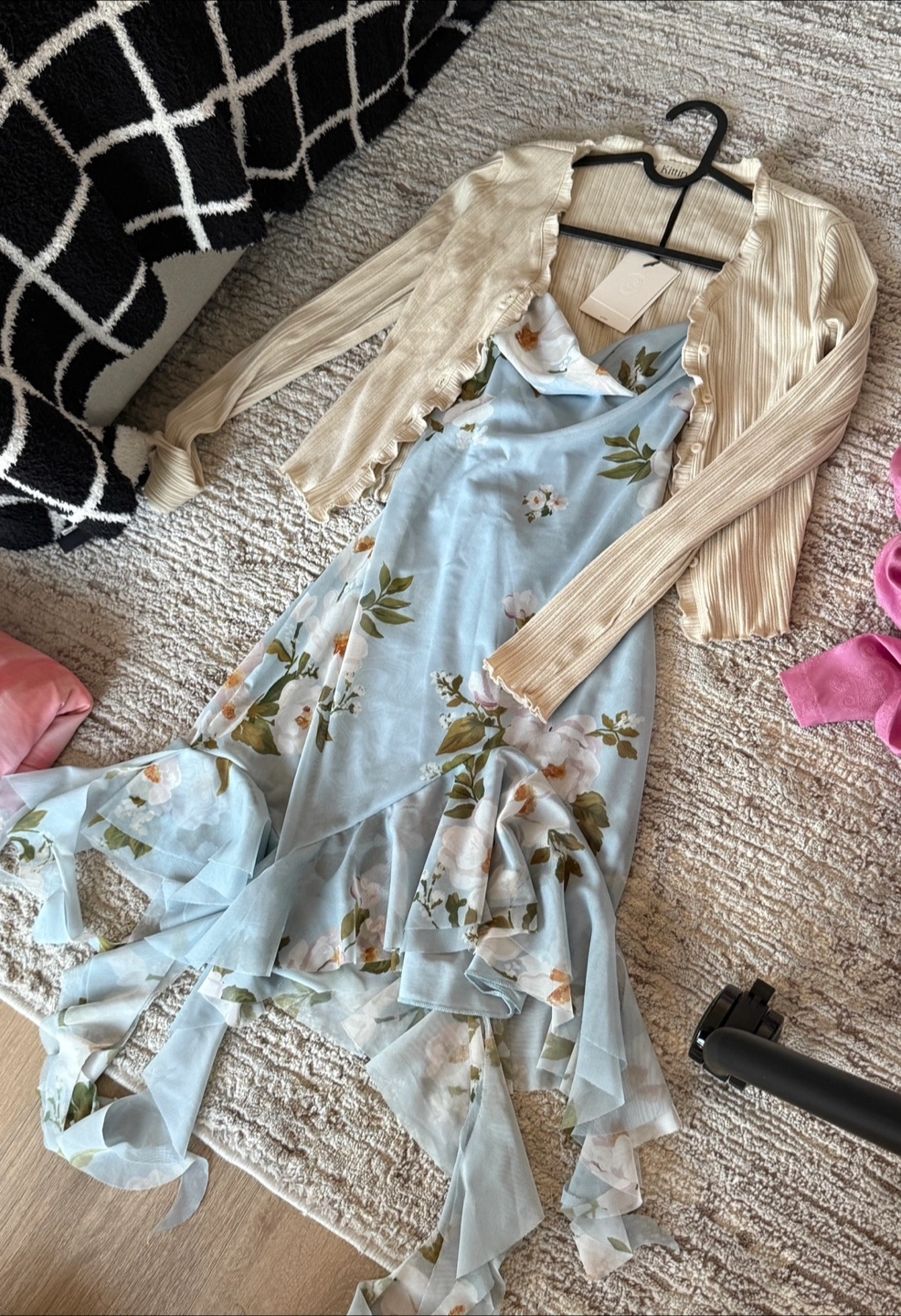 This dress is a beautiful floral print mini dress perfect for spring or summer. The dress features a unique asymmetrical hemline and delicate floral pattern. It's in great condition and ready for a new home!