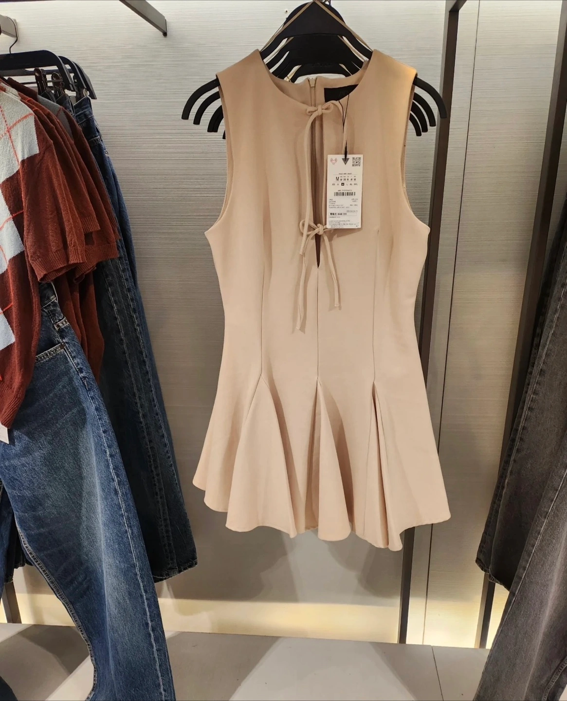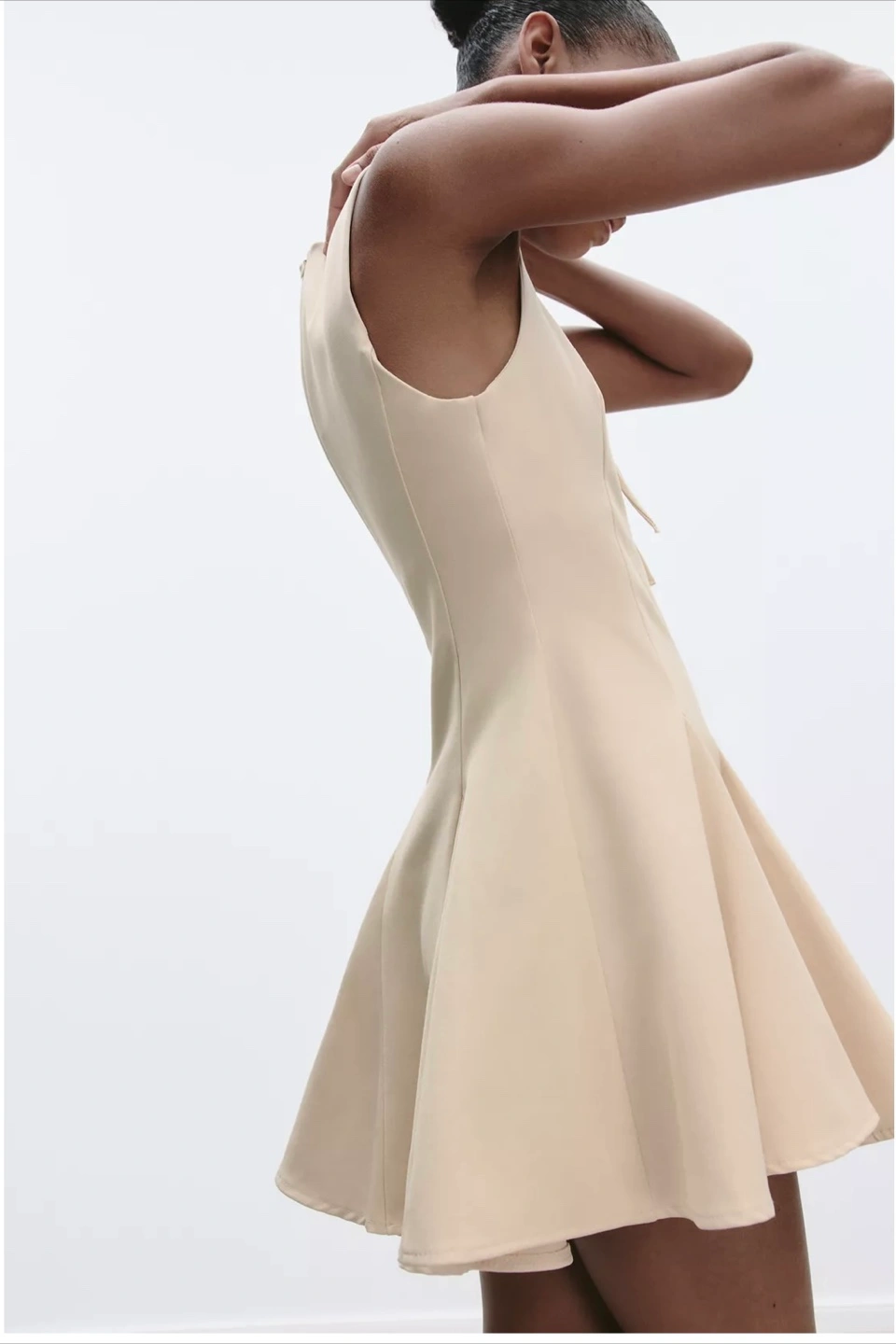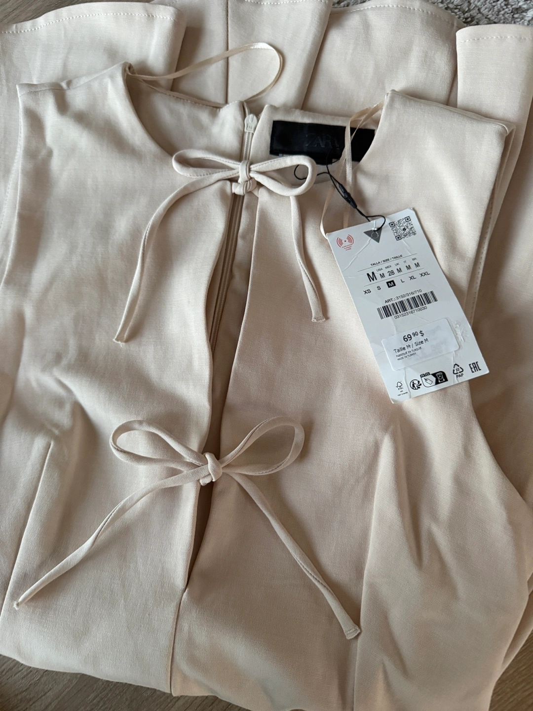 Selling a cute Zara mini dress in size M! It's a lovely beige colour with a pleated skirt design. Perfect for a casual day out or a special occasion. The dress features a tie detail at the neckline and has a comfortable fit. DT queen st pickup only
