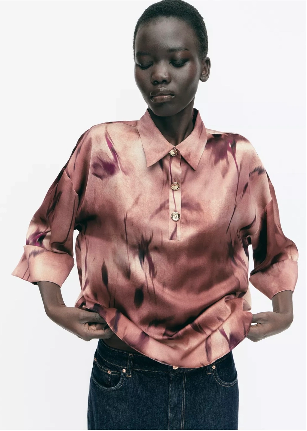 This is a Zara floral print satin shirt in size M. It features a beautiful floral pattern on a satin material, super smooth and comfortable. The shirt has a collared neckline and gold button details. DT queen st pickup only