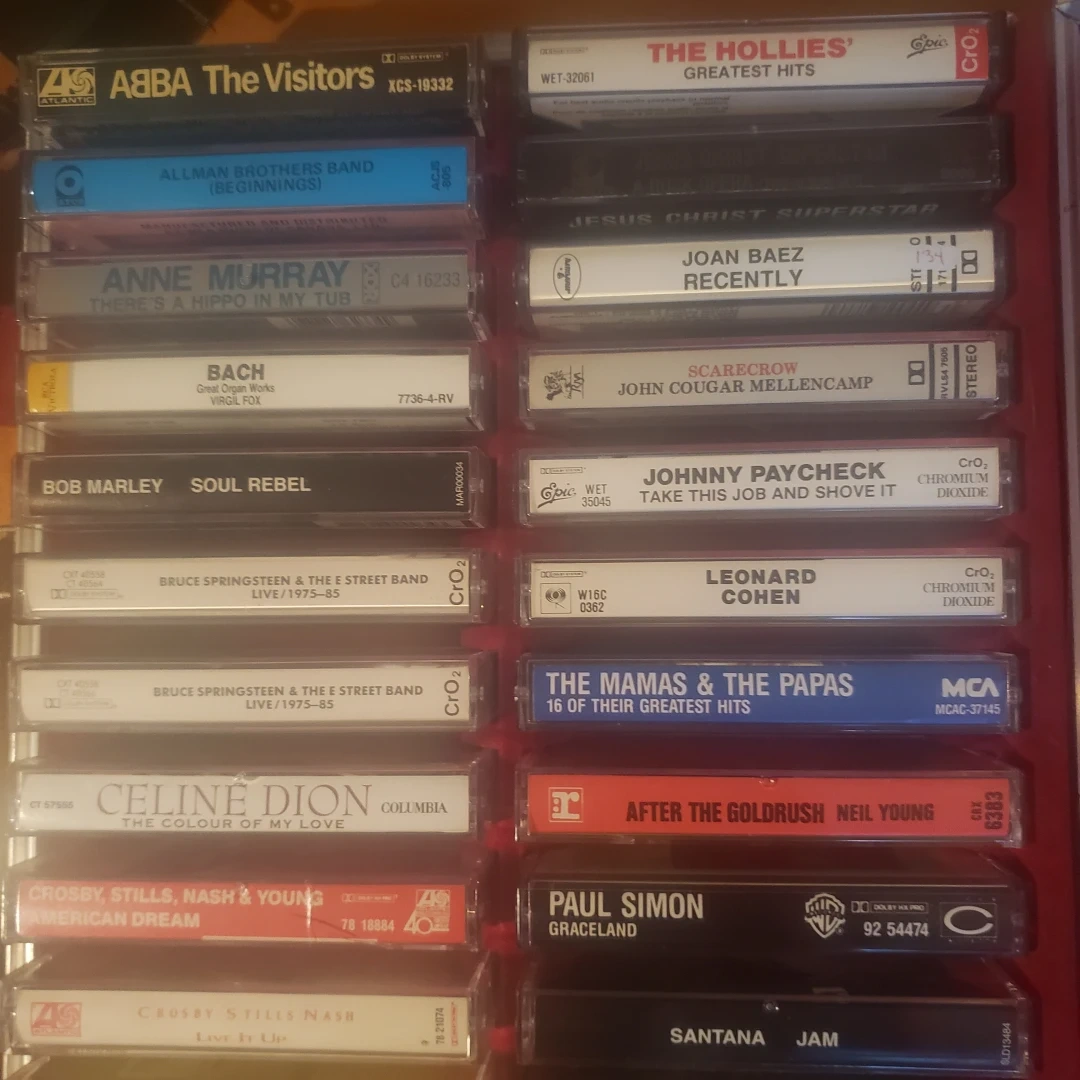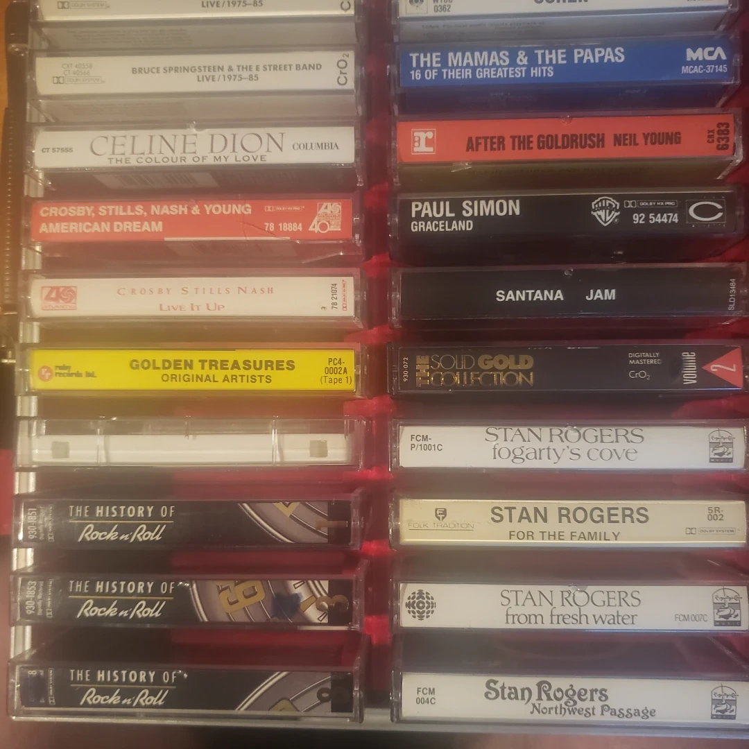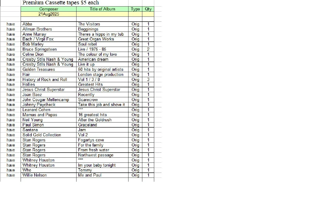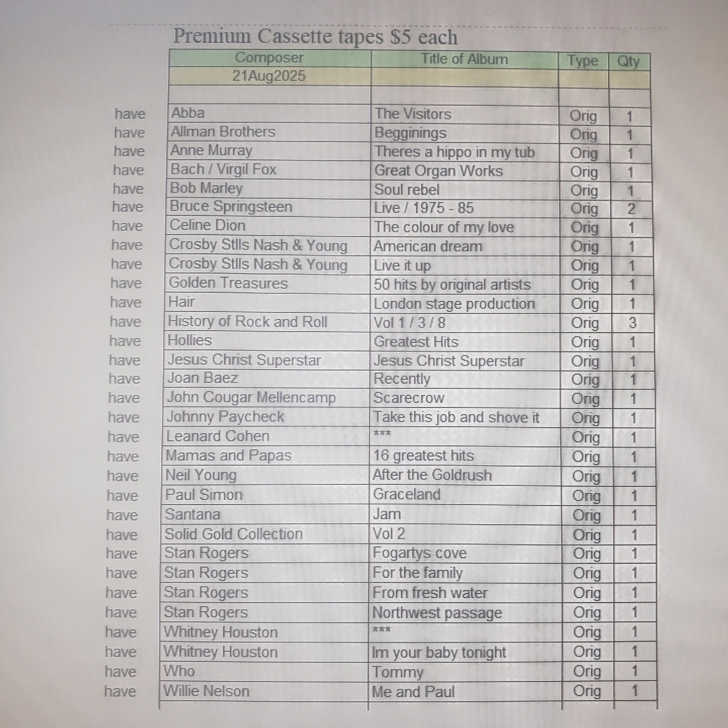 Selling a collection of premium cassette tapes! Each tape is priced at $5. Available titles include: - ABBA - The Visitors - Allman Brothers Band - Beginnings - Anne Murray - There's a Hippo in my Tub - Bach / Virgil Fox - Great Organ Works - Bob Marley - Soul Rebel - Bruce Springsteen - Live / 1975-85 - Celine Dion - The Colour of my Love - Crosby Stills Nash & Young - American Dream - Crosby Stills Nash & Young - Live it up - Golden Treasures - 50 hits by original artists - Hair - London stage production - History of Rock and Roll - Vol 1 / 3 / 8 - Hollies - Greatest Hits - Jesus Christ Superstar - Jesus Christ Superstar - Joan Baez - Recently - John Cougar Mellencamp - Scarecrow - Johnny Paycheck - Take this job and shove it - Leonard Cohen - *** - Mamas and Papas - 16 greatest hits - Neil Young - After the Goldrush - Paul Simon - Graceland - Santana - Jam - Solid Gold Collection - Vol 2 - Stan Rogers - Fogarty's cove - Stan Rogers - For the family - Stan Rogers - From fresh water - Stan Rogers - Northwest Passage - Whitney Houston - *** - Whitney Houston - I'm your baby tonight - Tommy The Who - Tommy - Willie Nelson - Me and Paul