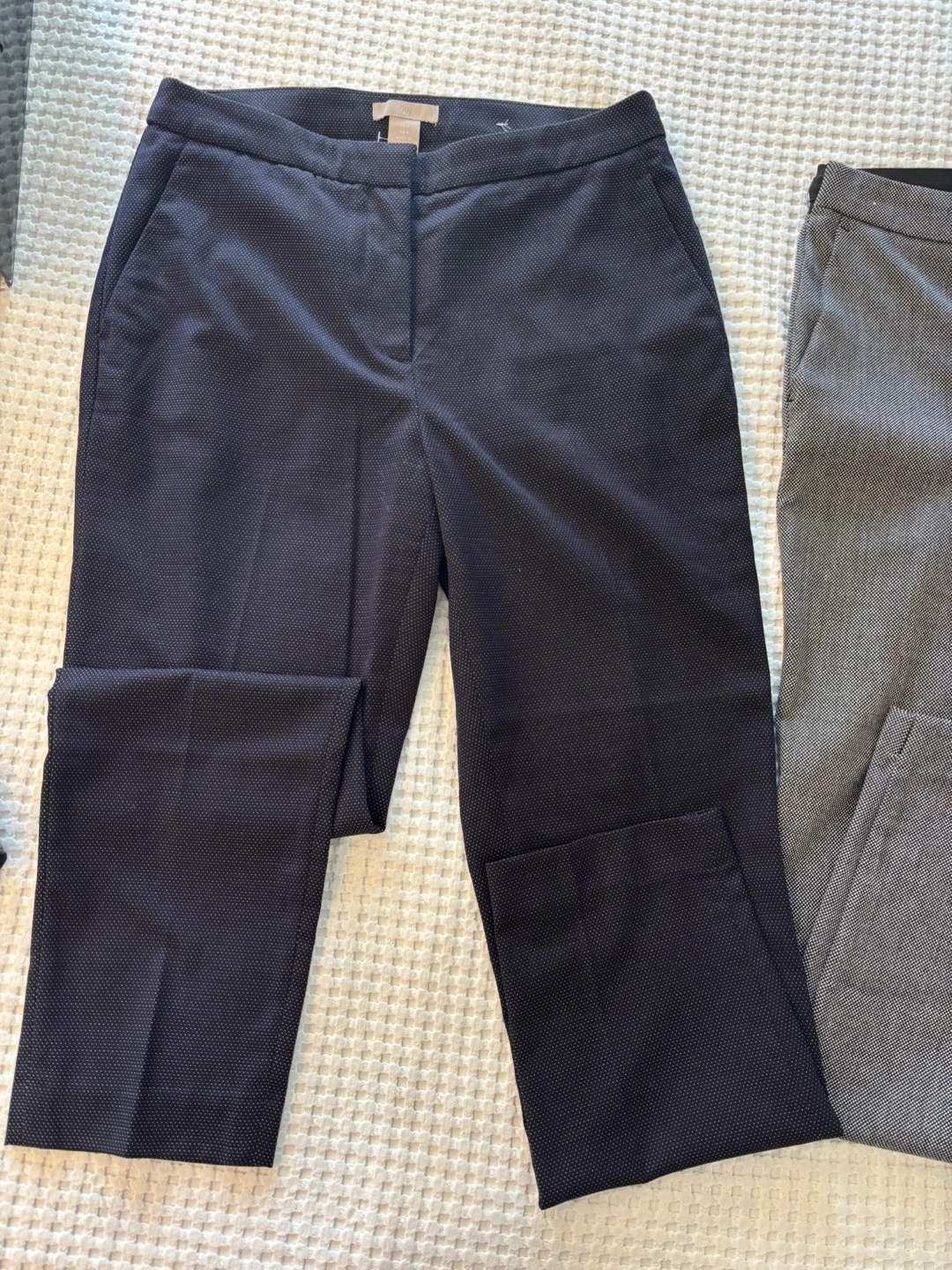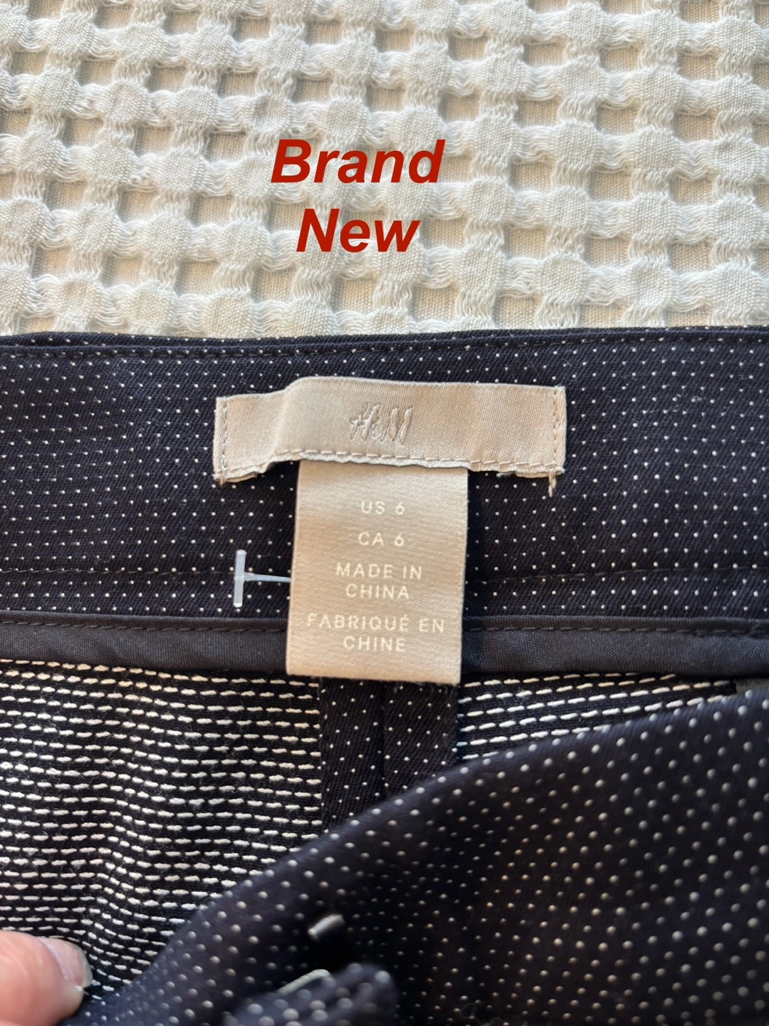 I'm selling a brand new pair of H&M pants! They're a stylish navy blue with a subtle polka dot pattern and are a size US 6. Perfect for dressing up or down!
