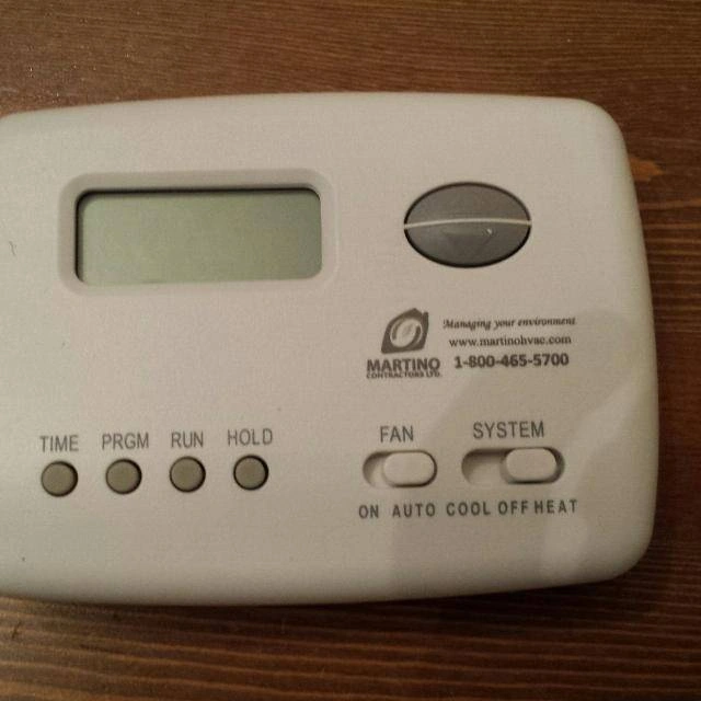 Digital programmable thermostat by Martino HVAC. Supports heat, cool, auto, and fan settings Programmable with time, run, hold functions Compact design with LCD display Uses 2 AAA batteries (included for demo, recommend replacing before use) Great for replacing a broken thermostat or as a budget-friendly backup Condition: Used, but in working condition.