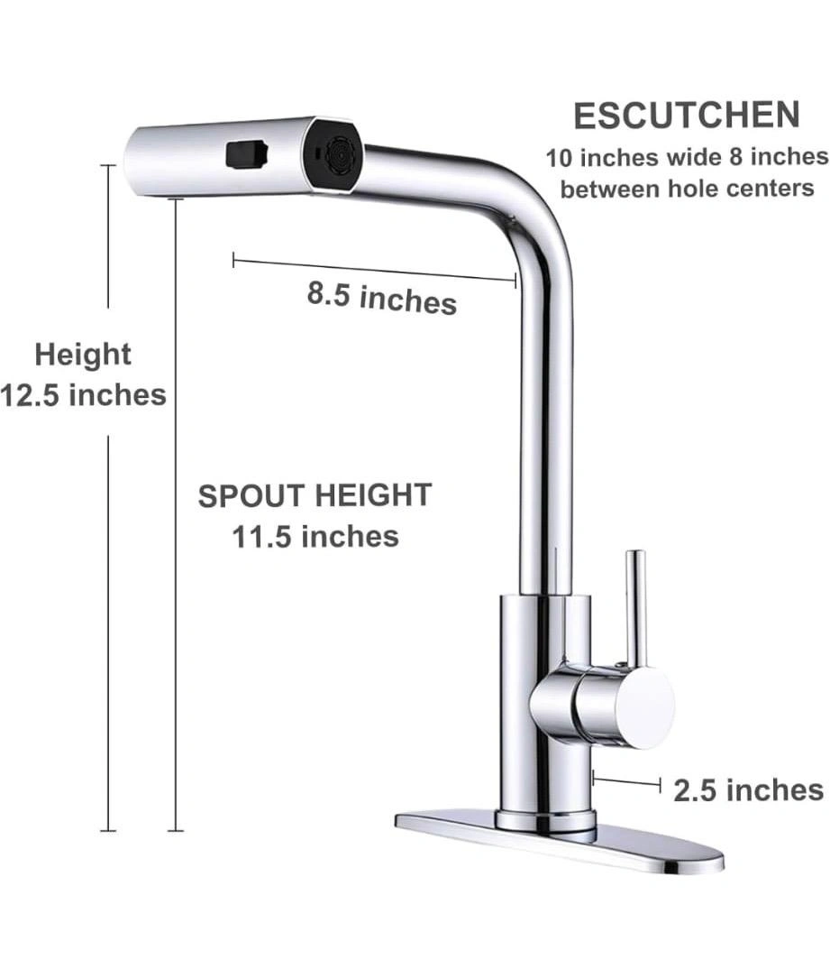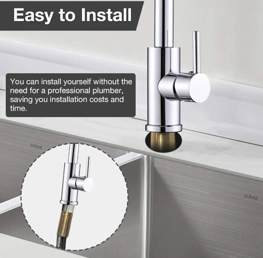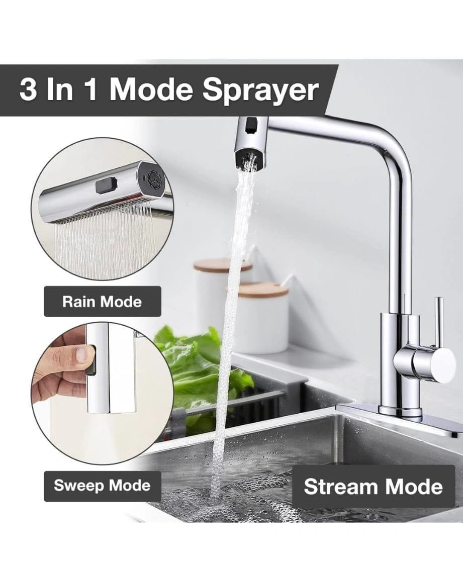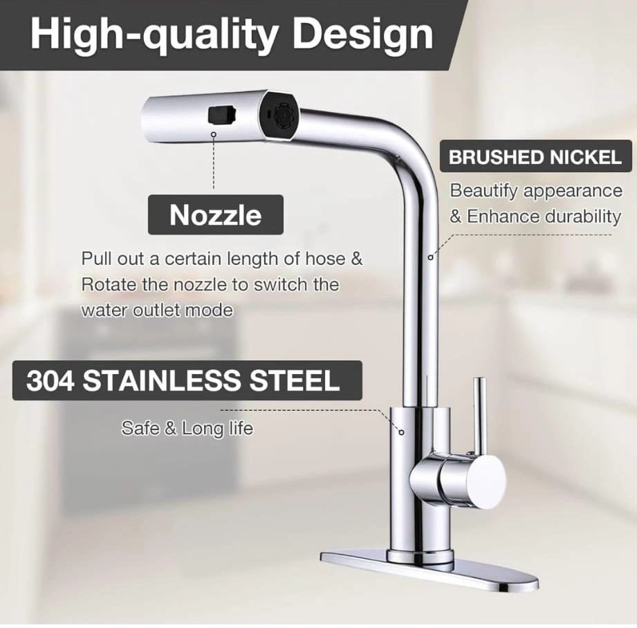 This is a Zuhne kitchen faucet with a brushed nickel finish. It features a pull-out hose and a 3-in-1 mode sprayer (rain, sweep, and stream). Made of 304 stainless steel for safe and long life. Easy to install yourself, saving on plumber costs