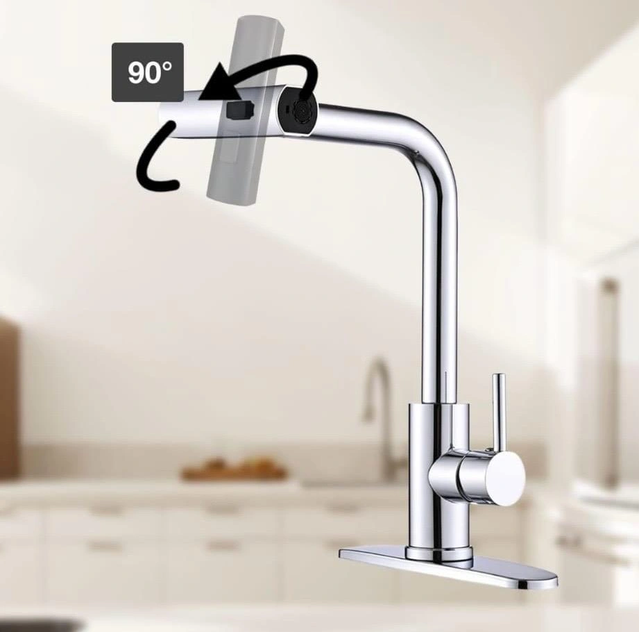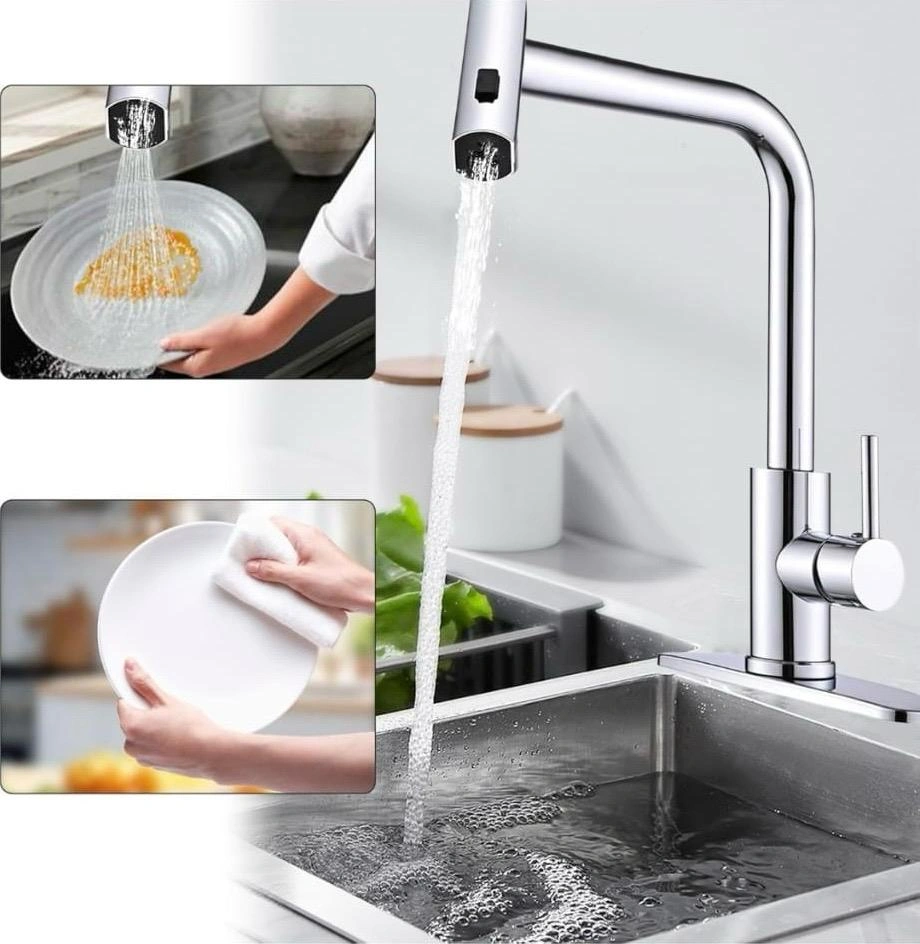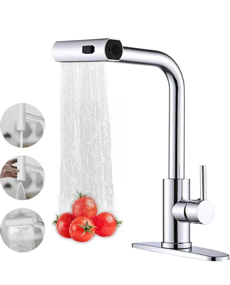 This is a Zuhne kitchen faucet with a brushed nickel finish. It features a pull-out hose and a 3-in-1 mode sprayer (rain, sweep, and stream). Made of 304 stainless steel for safe and long life. Easy to install yourself, saving on plumber costs