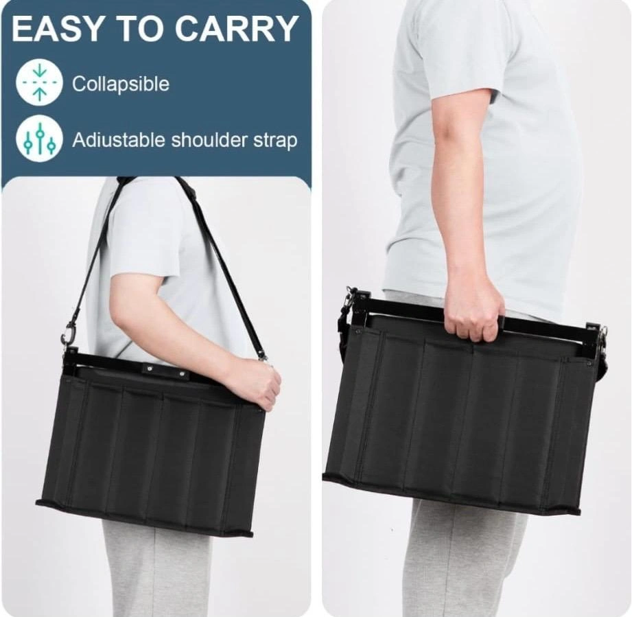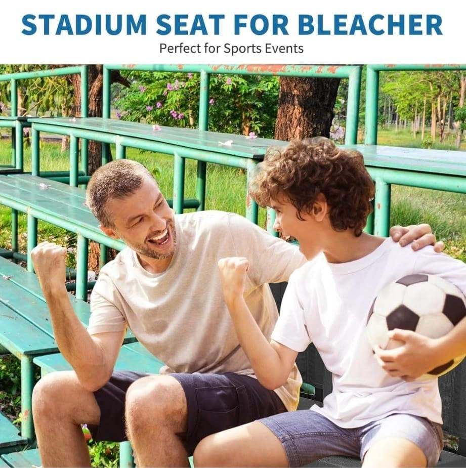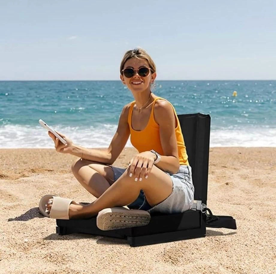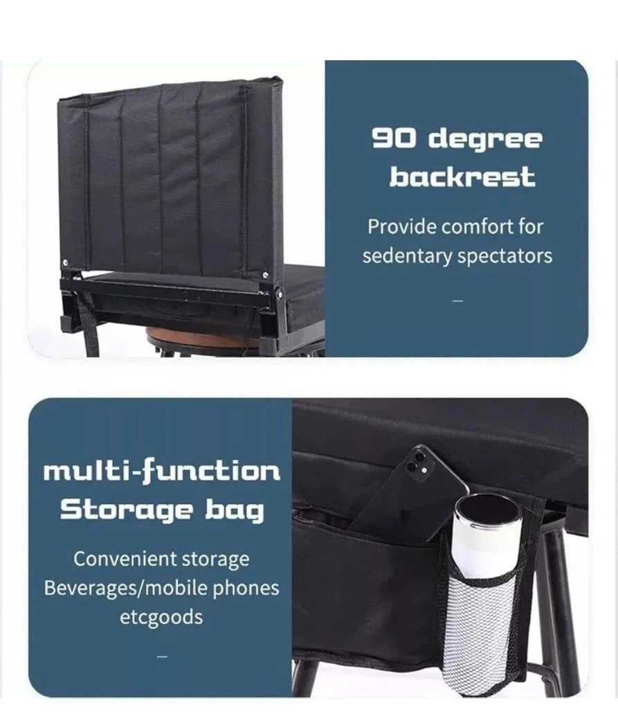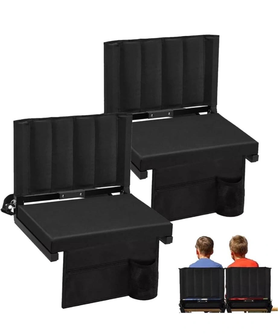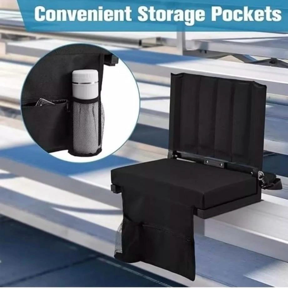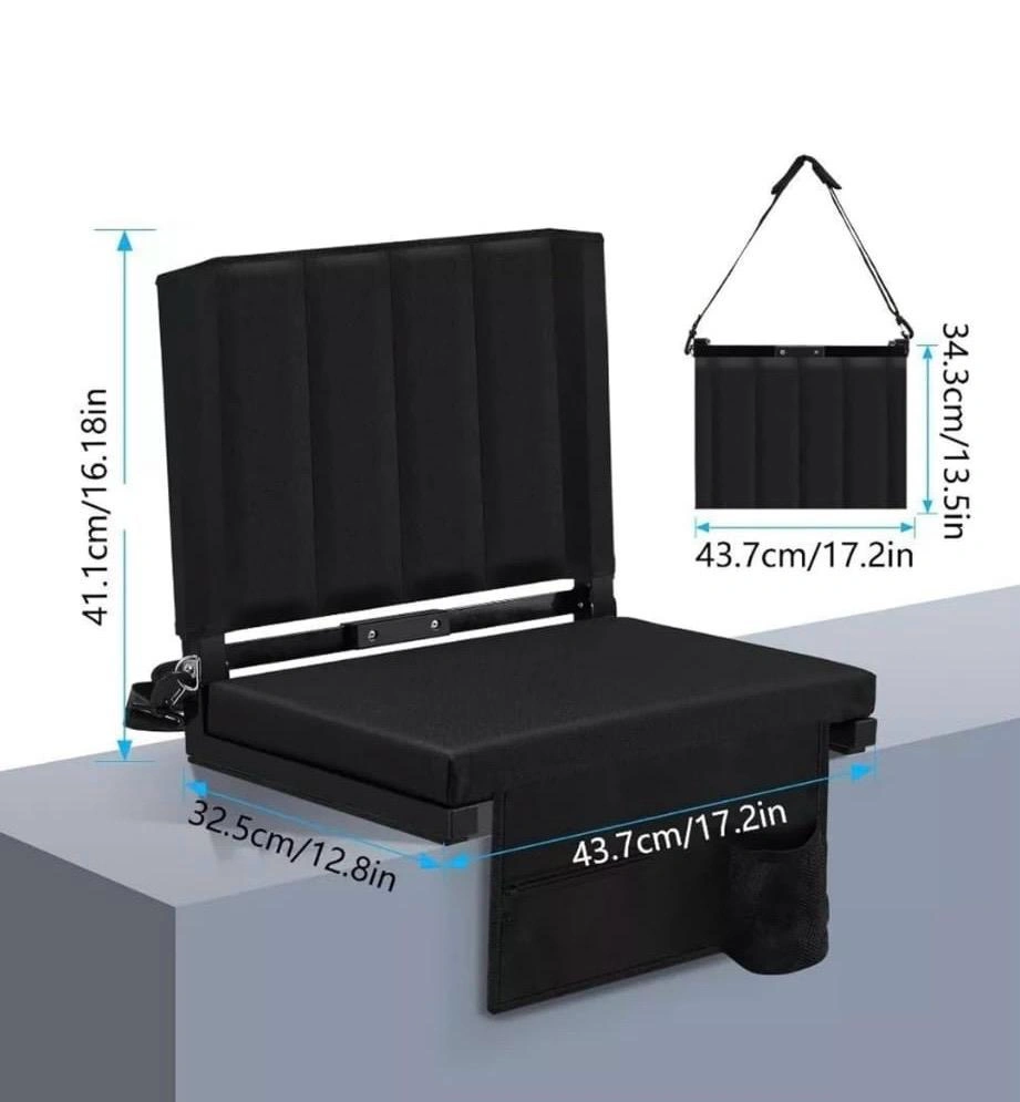 This stadium seat is perfect for sedentary spectators! It's black, collapsible, and easy to carry with its adjustable shoulder strap. It also has convenient storage pockets for beverages and mobile phones