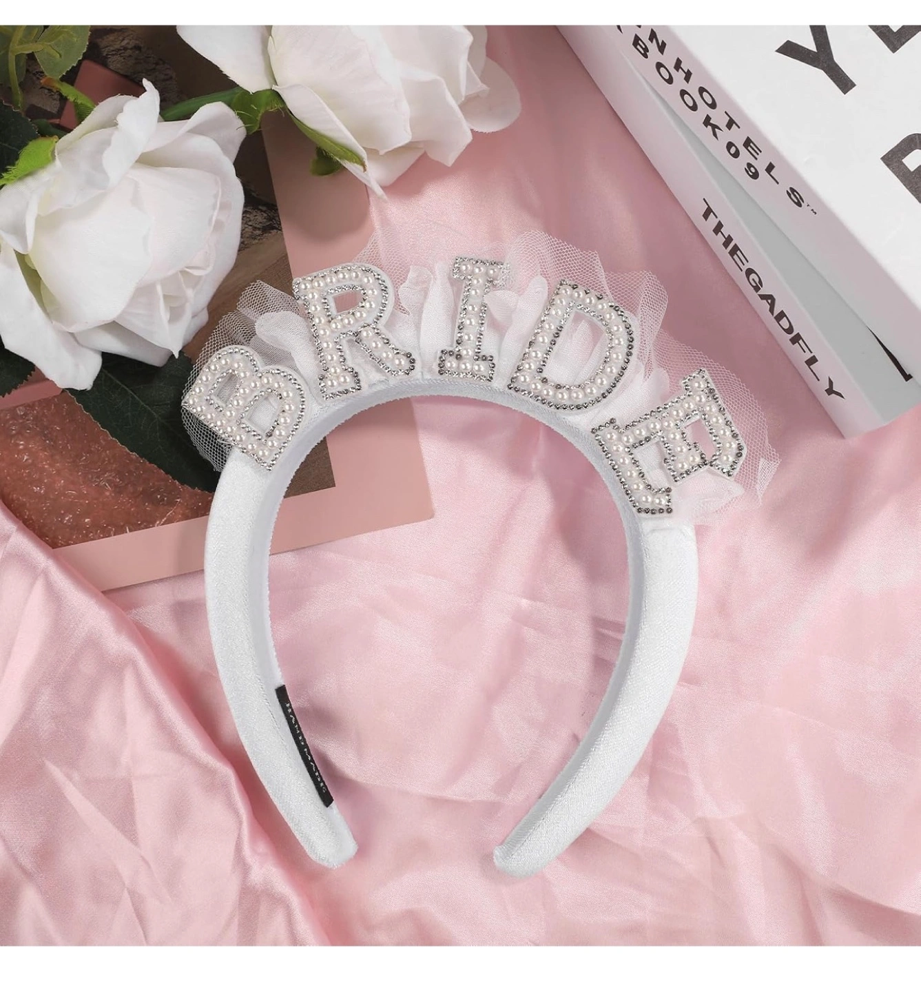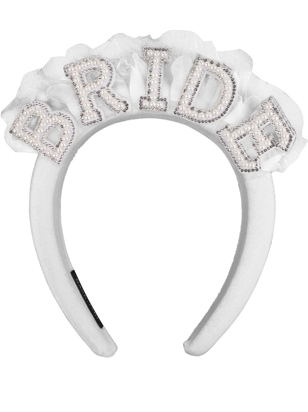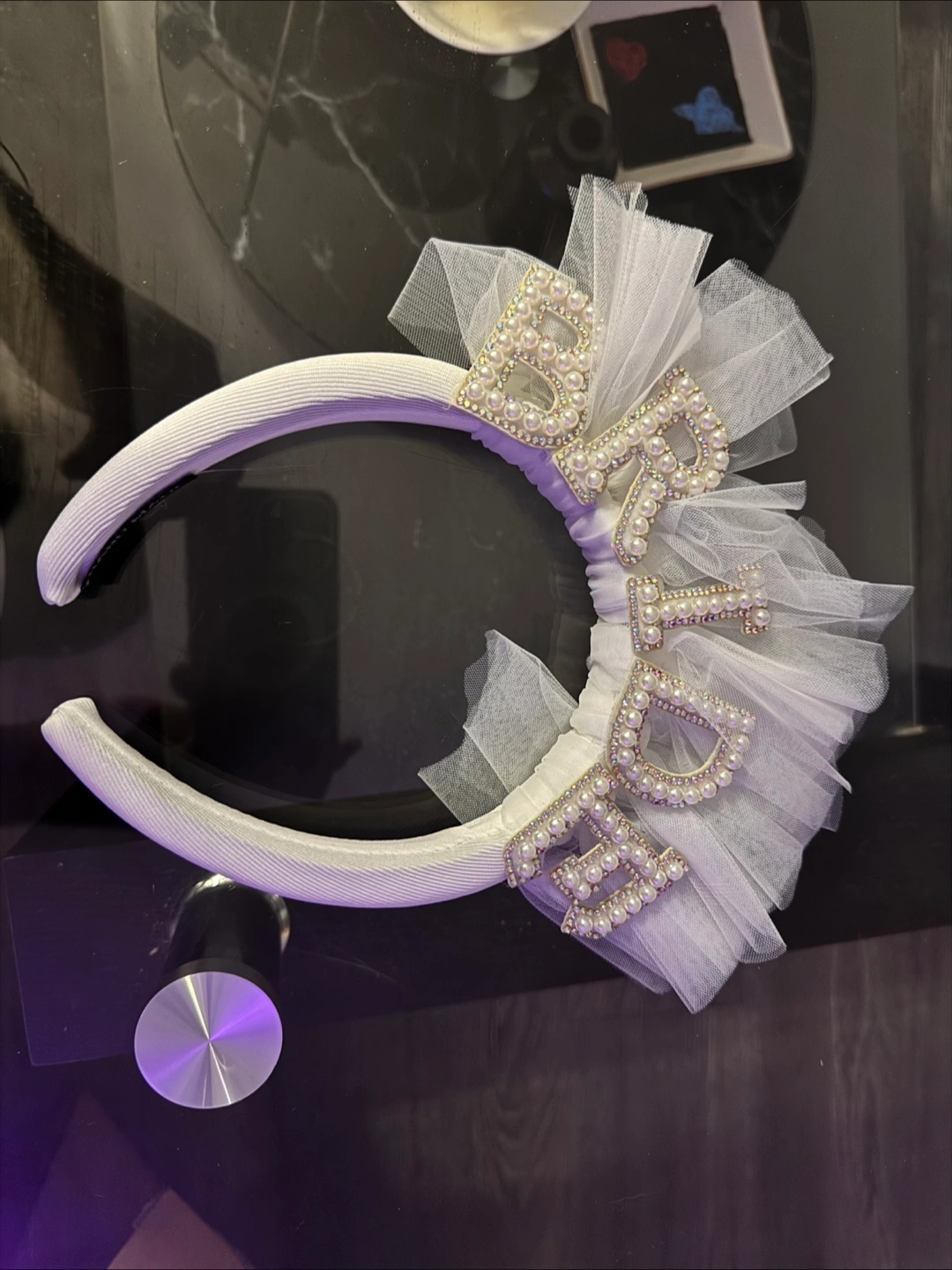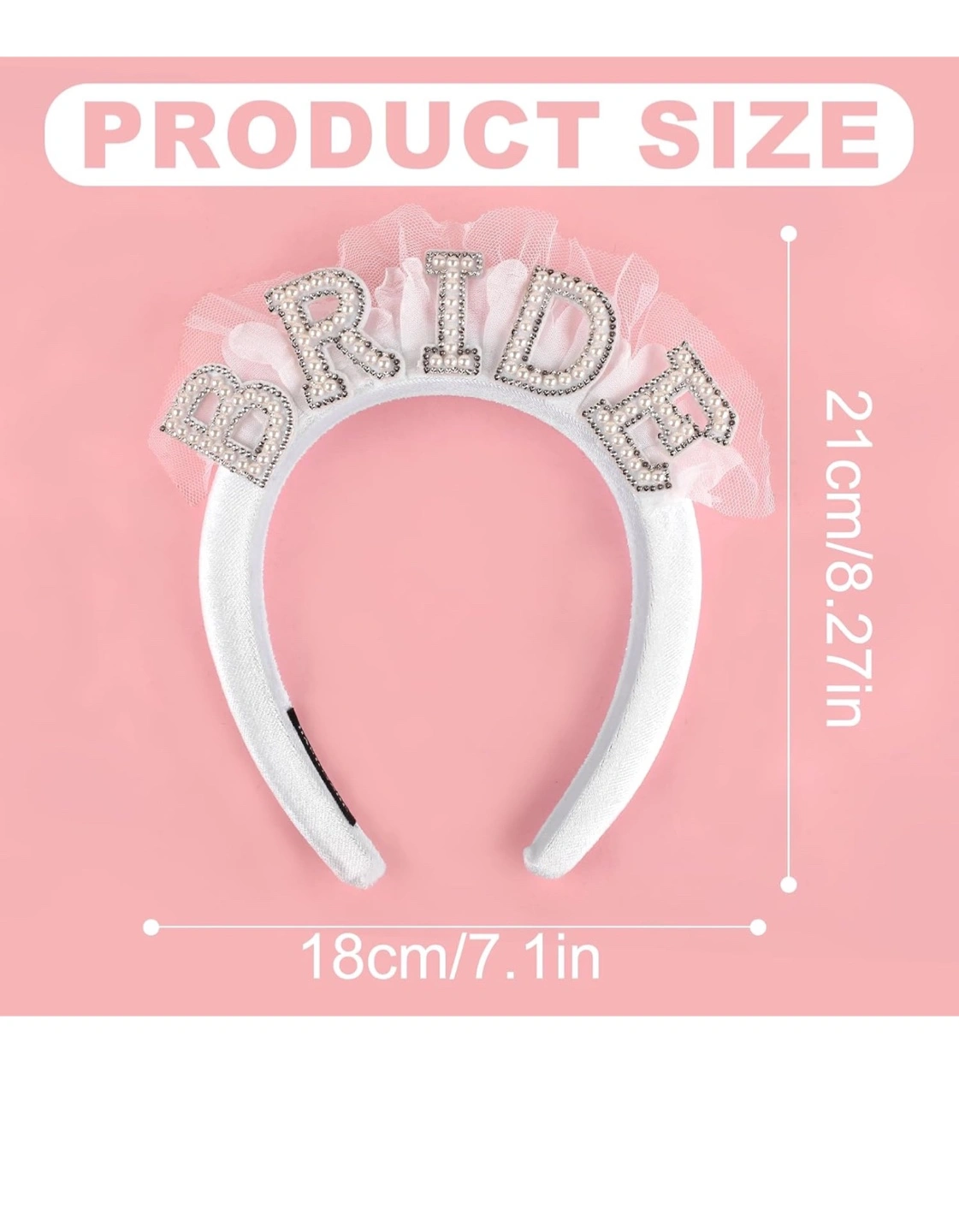 Selling a cute 'Bride' headband, perfect for a wedding or bridal shower! It's white with pearl and rhinestone detailing. The headband measures approximately 8.27 inches in height and 7.1 inches in width