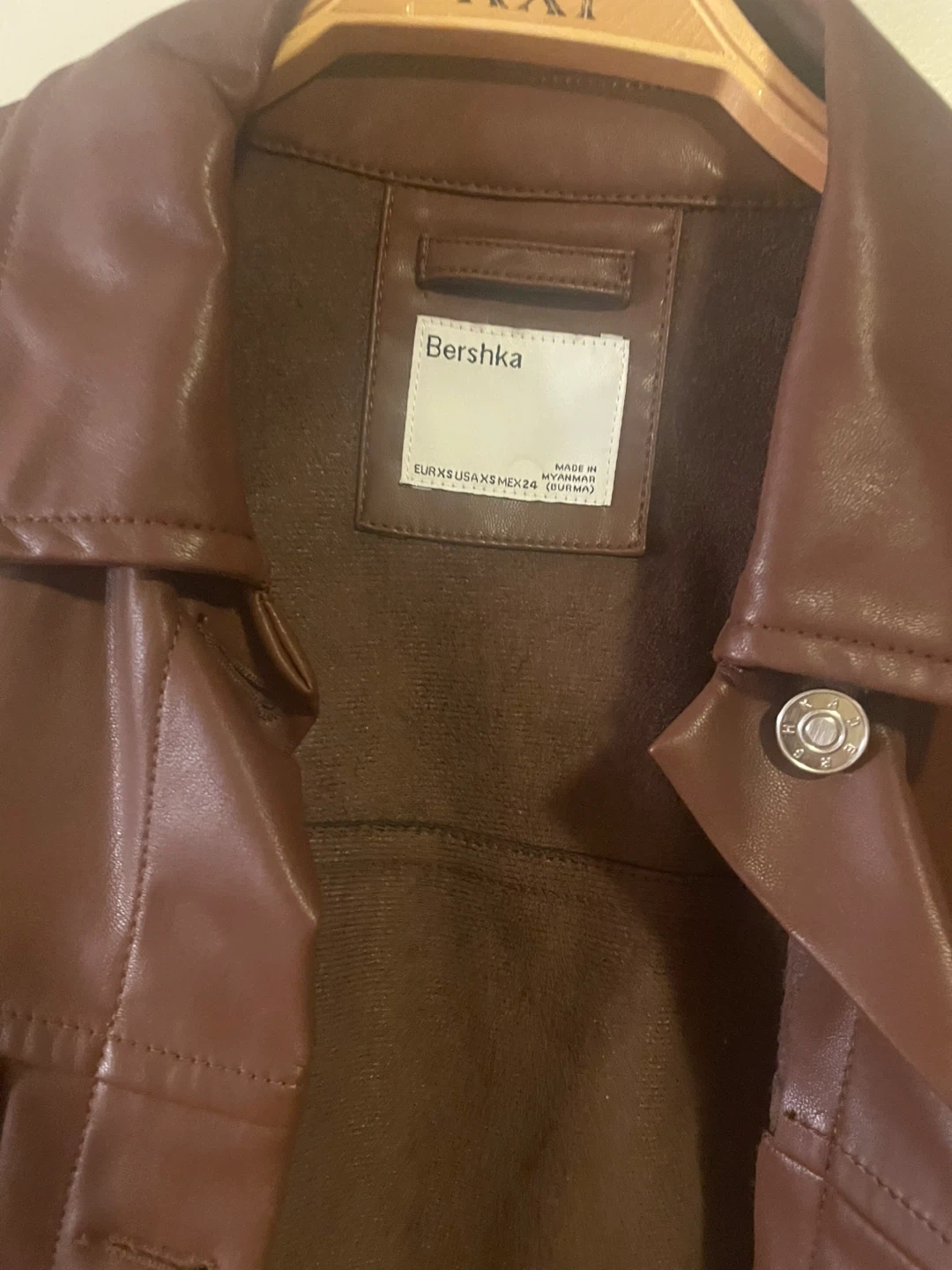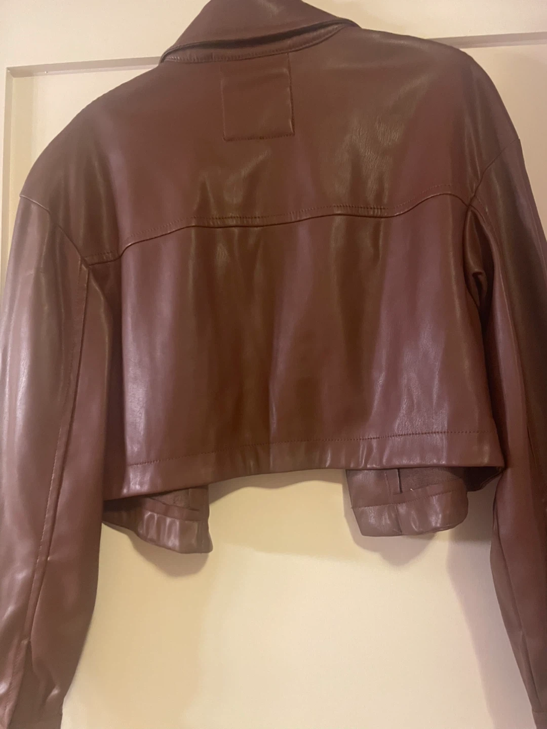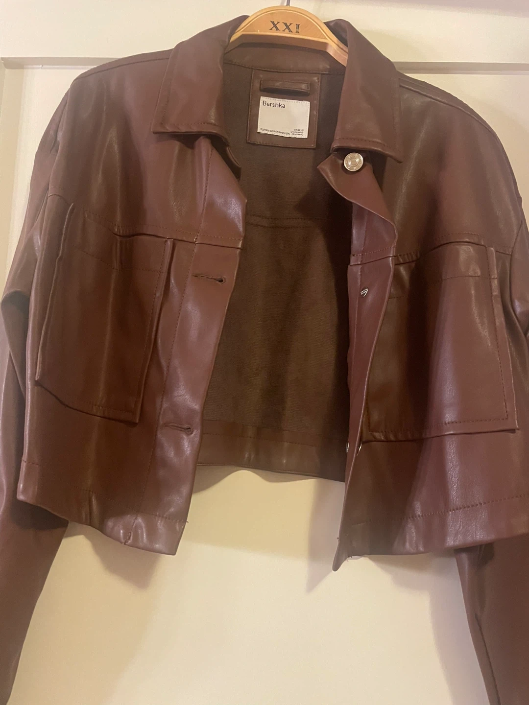 Selling a cute Bershka cropped jacket in a rich brown colour! It's made of faux leather. Perfect for layering or wearing on its own for a stylish look