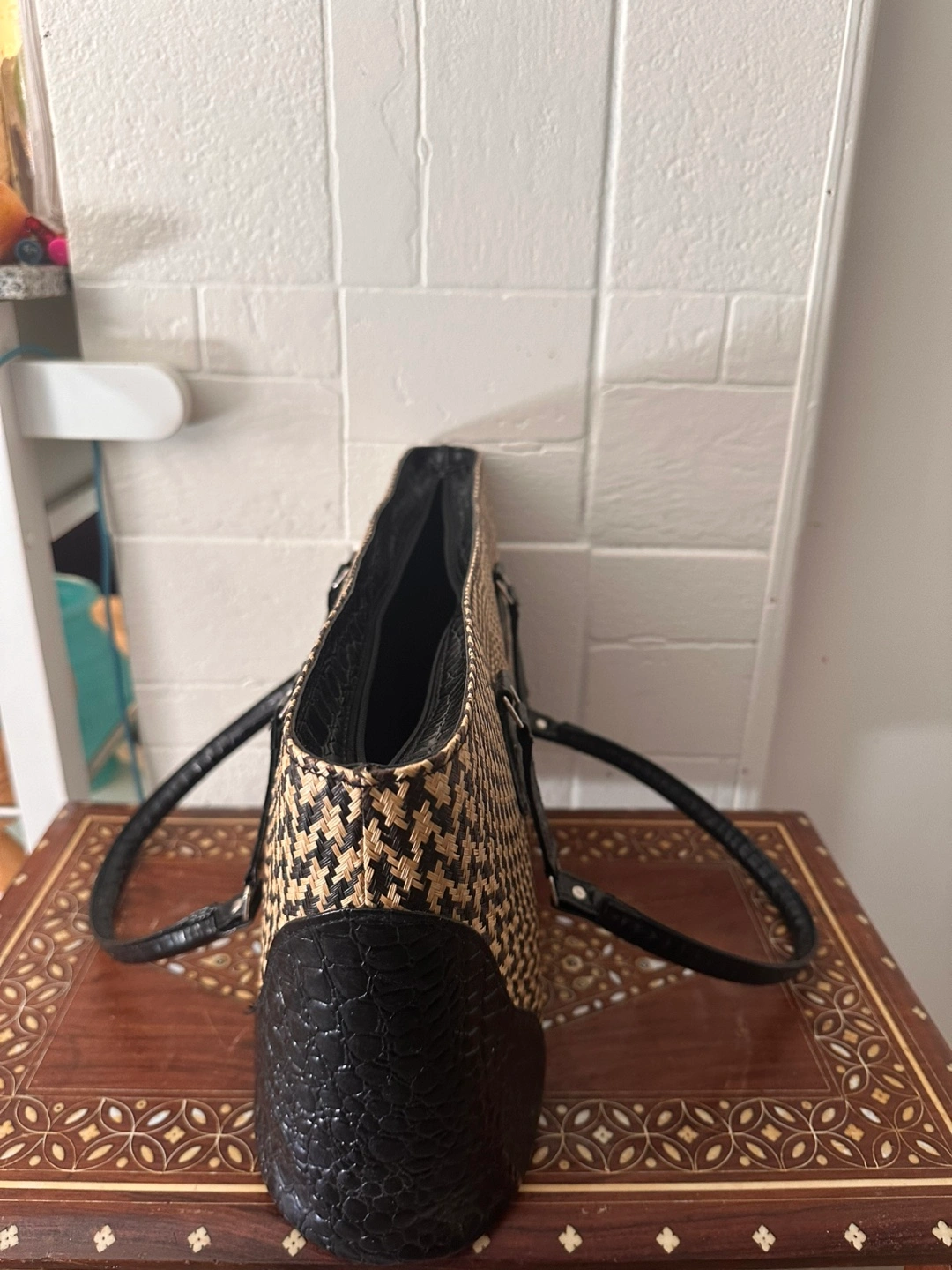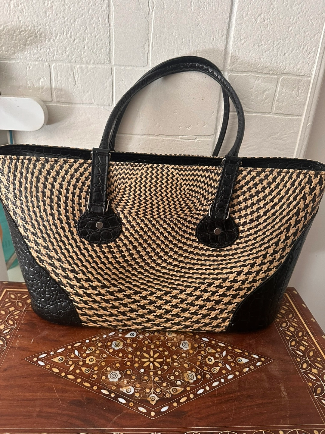 Here's a stylish woven tote bag with black accents! It's perfect for everyday use and has a unique design. It's in great condition and ready for a new home