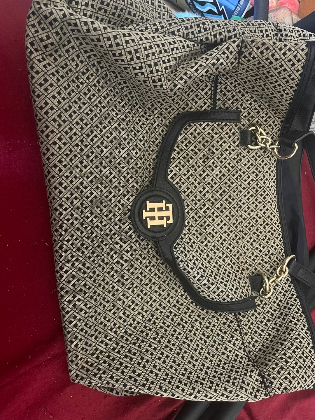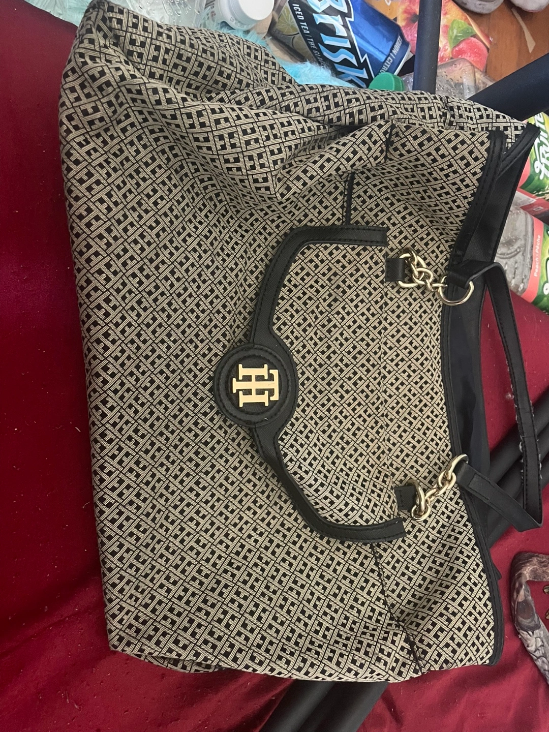 Here's a Tommy Hilfiger tote bag up for grabs! It features a repeating pattern and the iconic TH logo. It's in great shape and ready for a new home