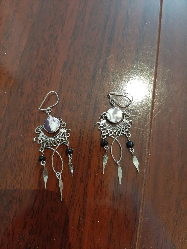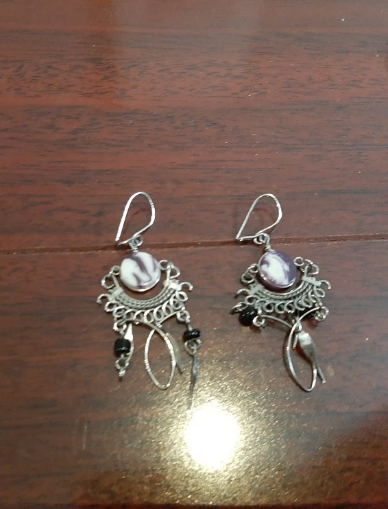 Free pair of dangle earrings. They feature a unique design with purple and white stones and black bead accents. These earrings would make a lovely addition to any jewelry collection. Pick up Scarborough.