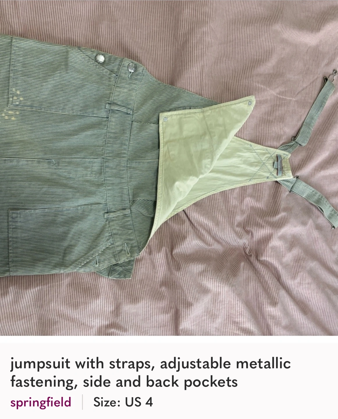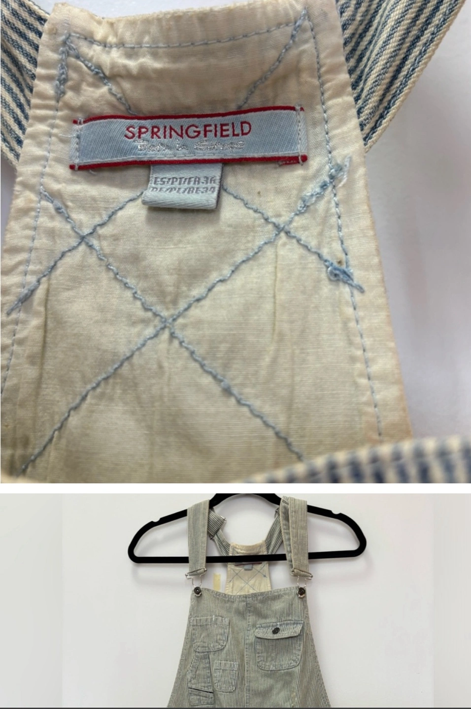 Here are some cute Springfield overalls! They're a size US 4 and feature a striped pattern. They have adjustable metallic fastenings and side and back pockets.