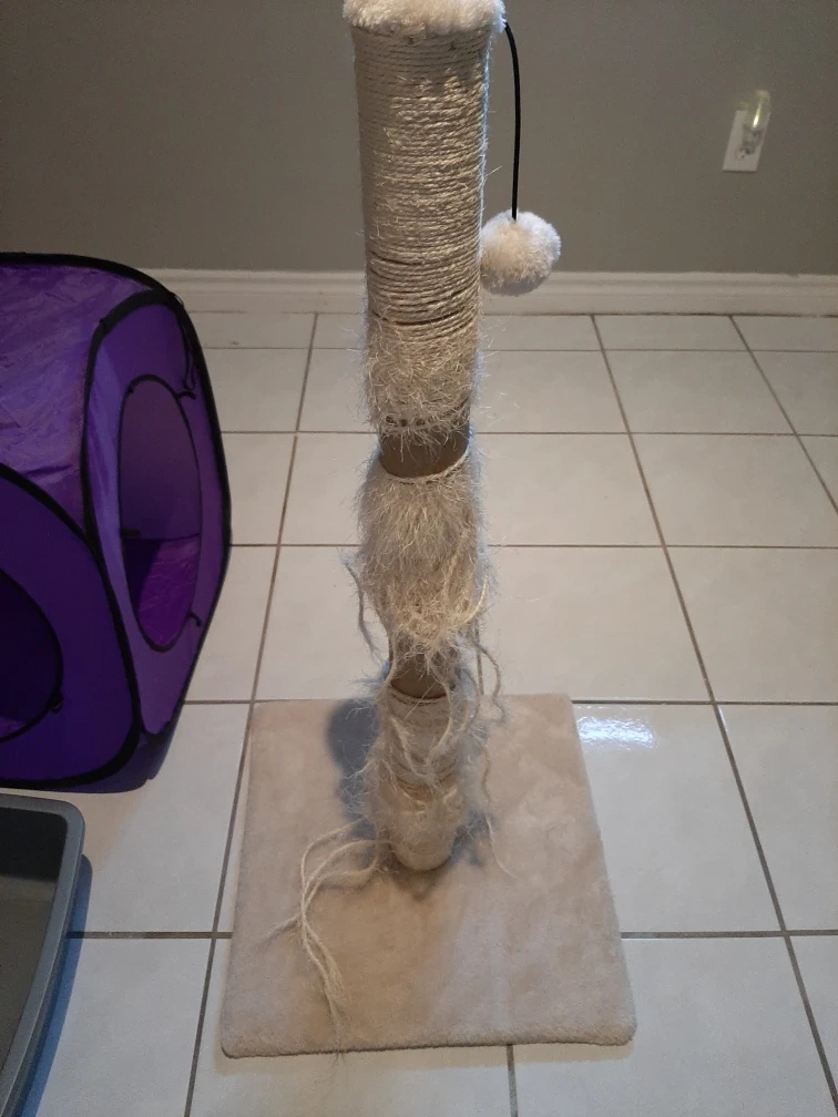Selling a used cat scratching post. It has a sturdy base and a sisal rope-covered post for your cat to scratch and play with. There is also a toy attached to the post. Pick up Scarborough.