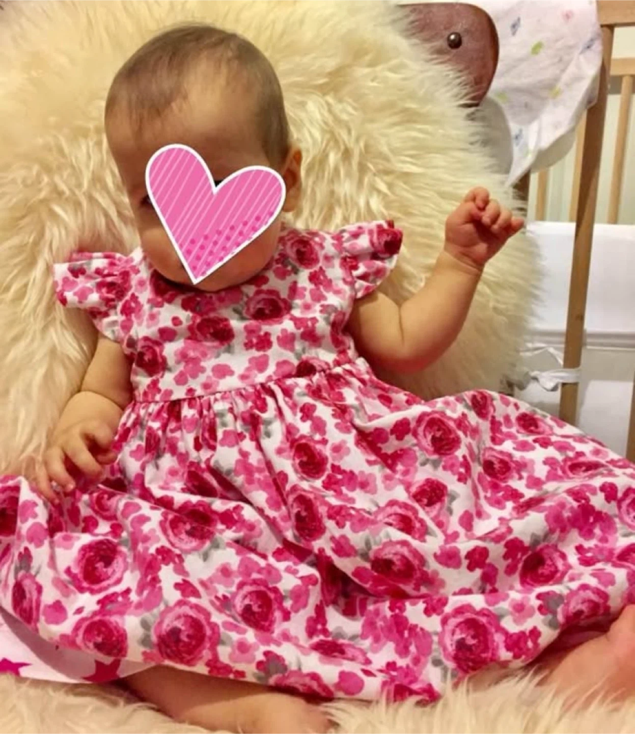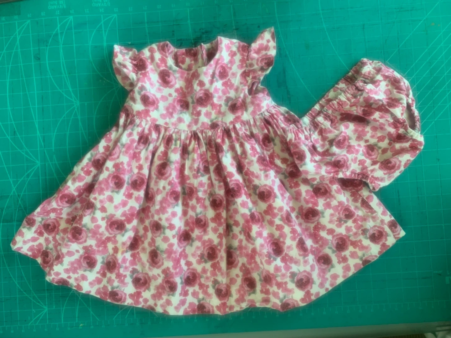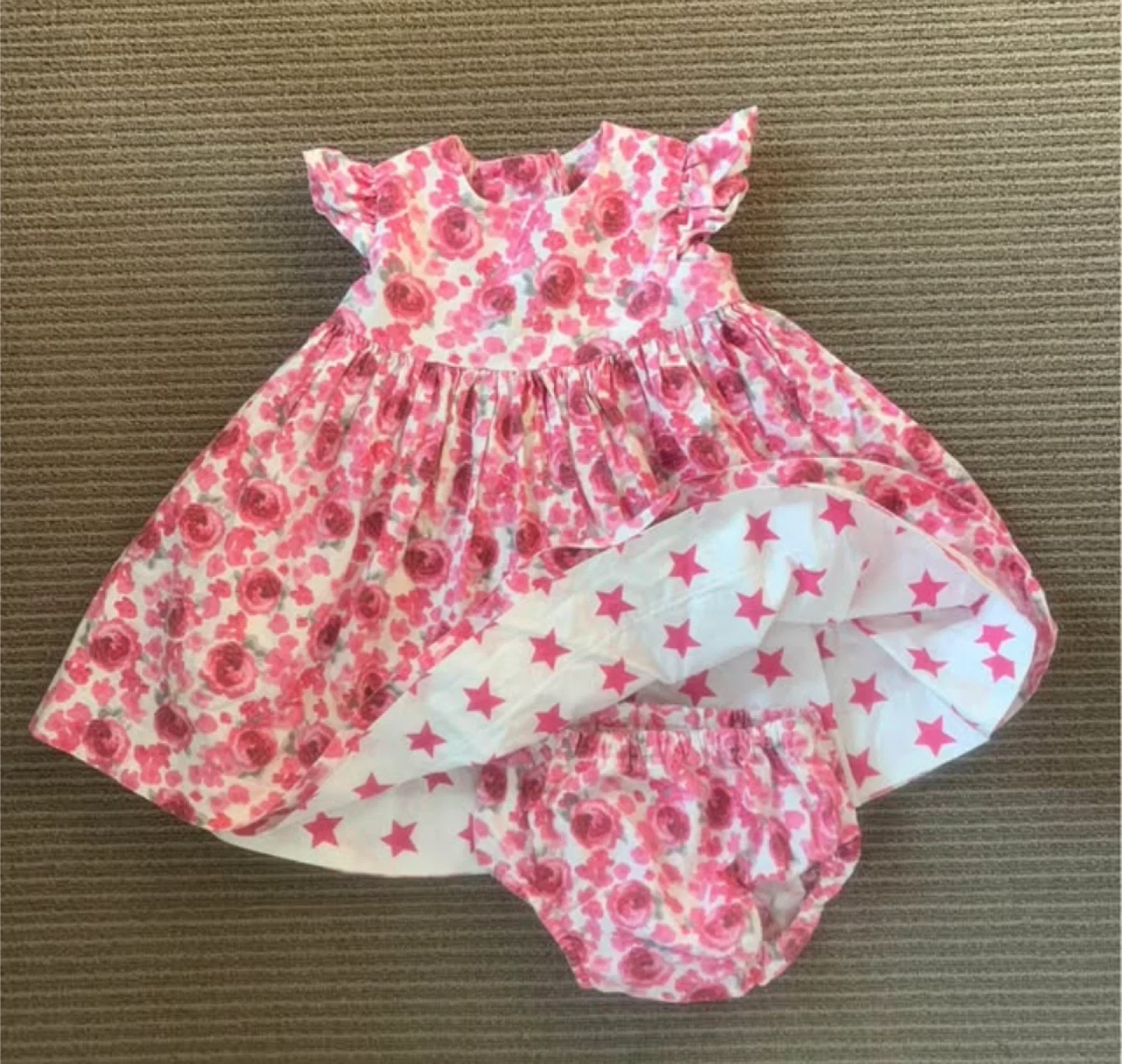 This adorable baby dress comes with matching bloomers! It's a sweet floral pattern in pink and white. The dress has cute flutter sleeves and a gathered skirt, and the bloomers are elasticated for a comfy fit. Size 12-18 months. Some orange stains . Pick up at Eglinton Ave east at Bayview.