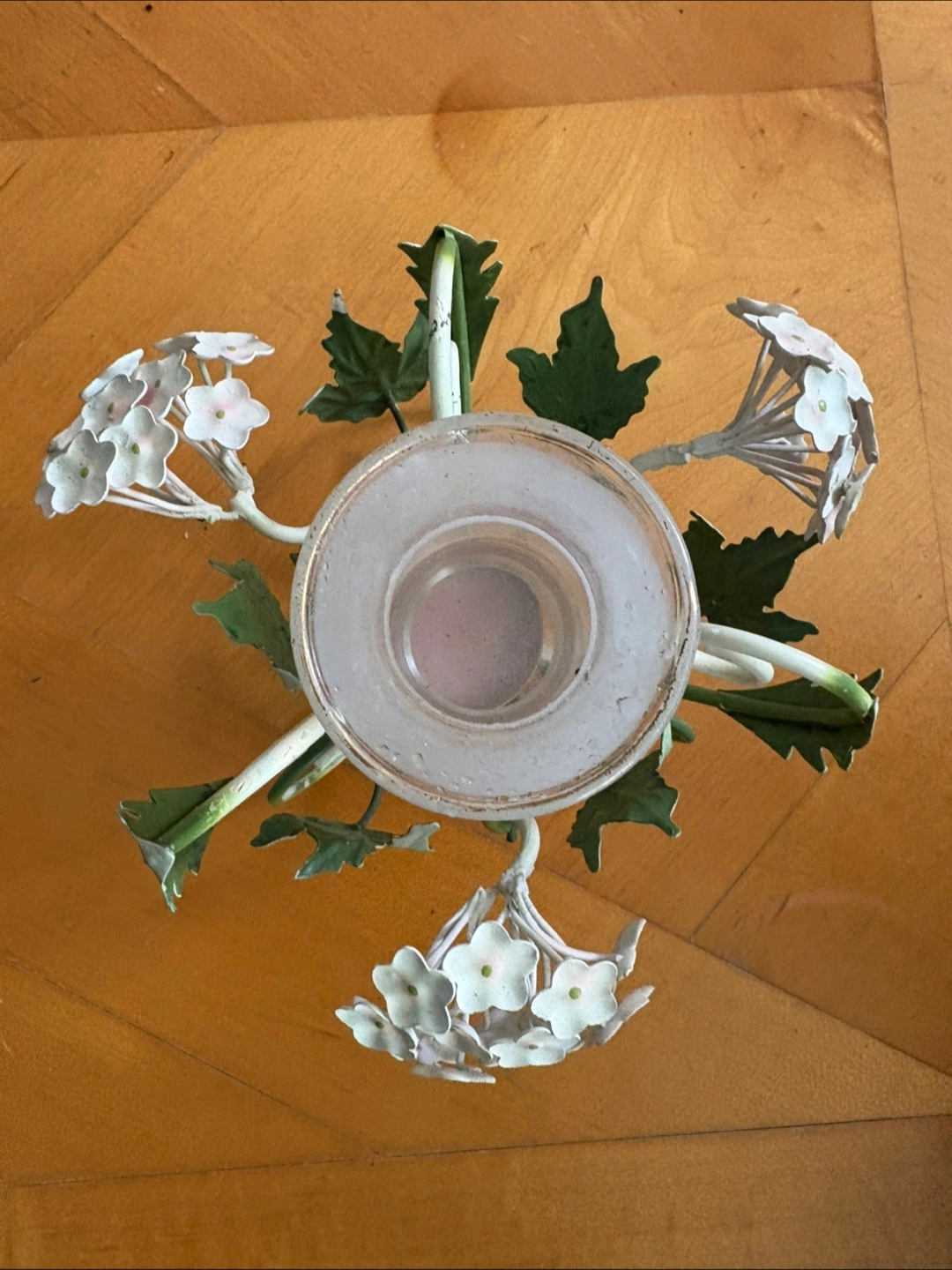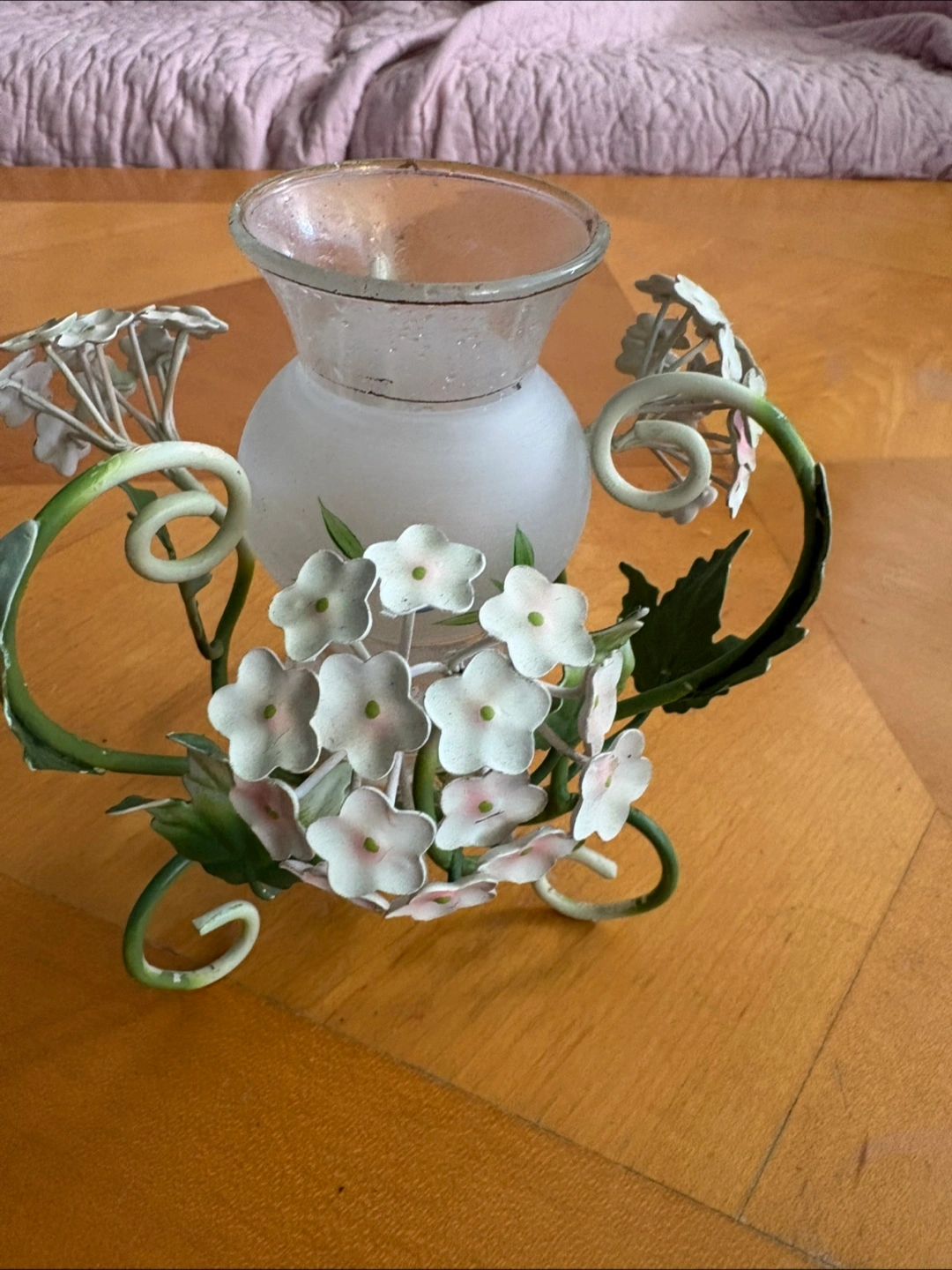 A lovely floral candle holder with a glass insert. It has a metal frame with floral accents. Perfect for adding a touch of elegance to any room! I will clean it prior to pick up. Only available for pick up.