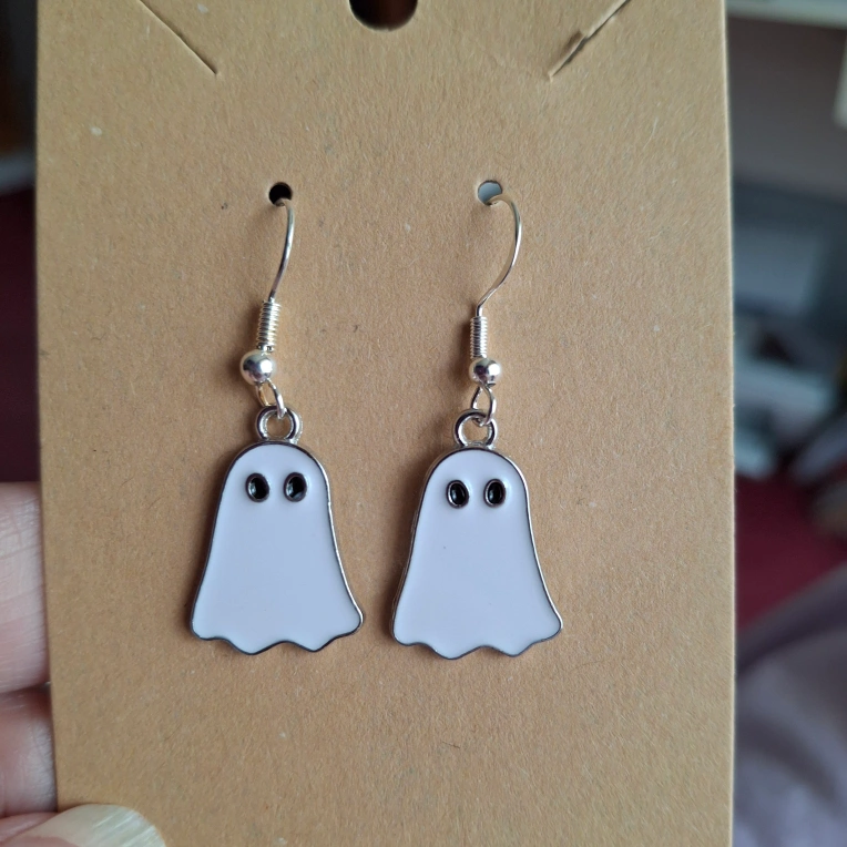 These are a pair of cute ghost dangle earrings! They're perfect for Halloween or any time you want to add a spooky touch to your outfit. The earrings feature a white ghost charm with black eyes and a silver finish.