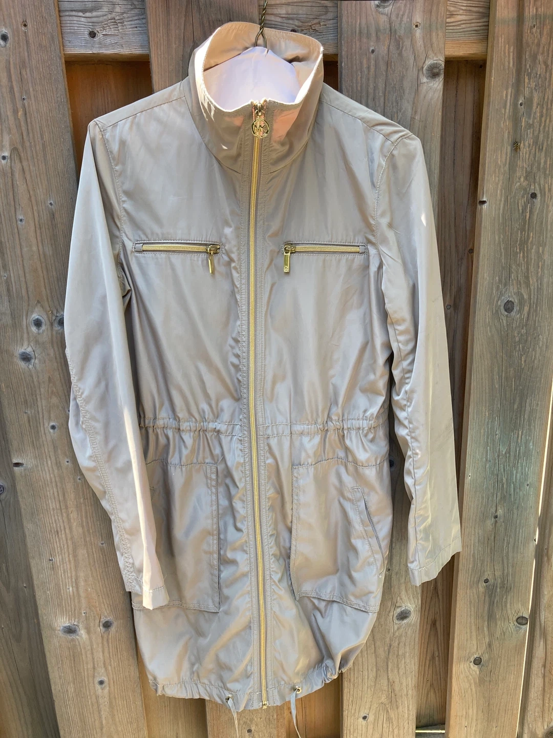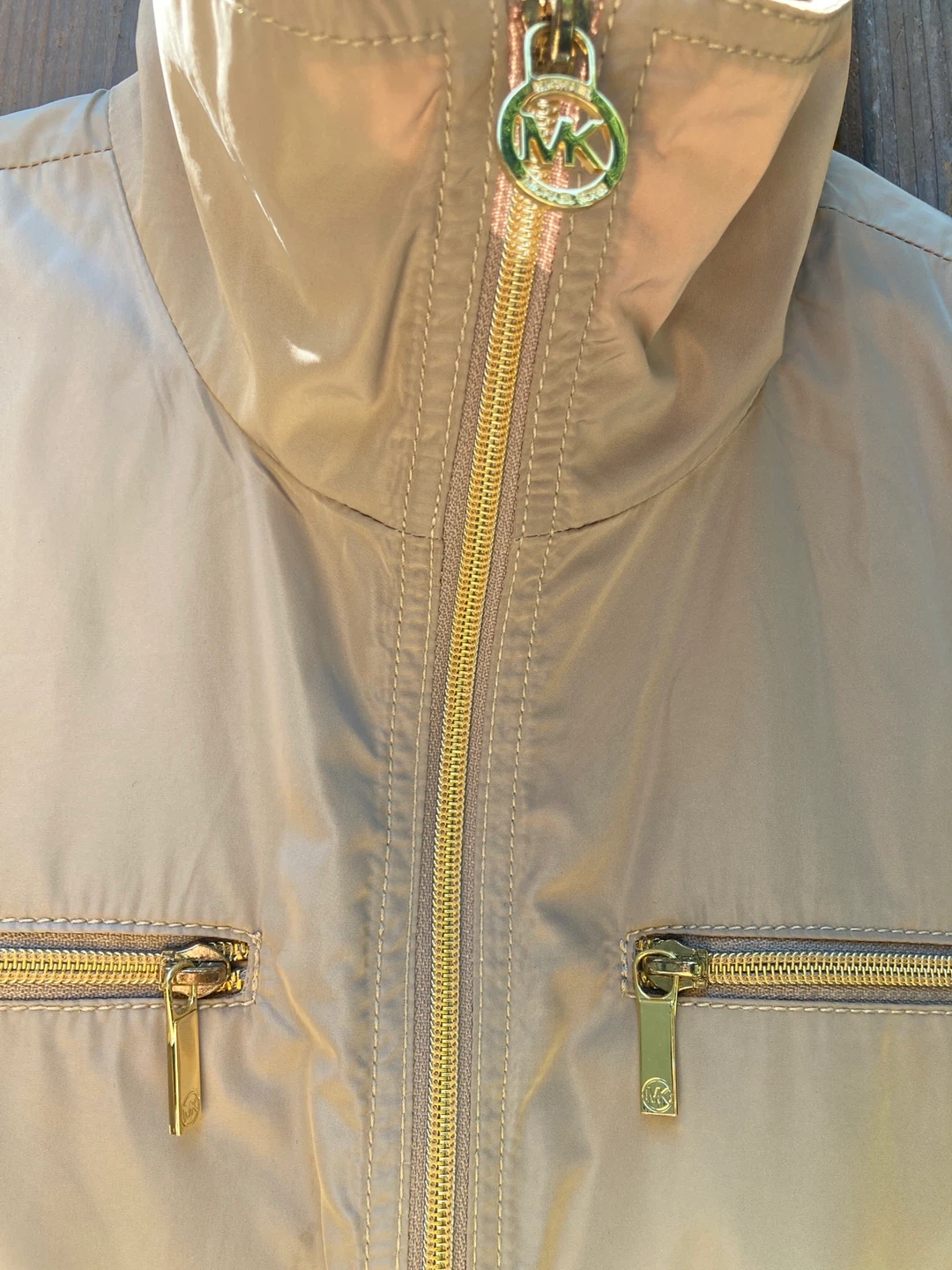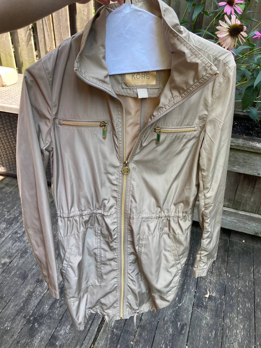 Tan/gold Michael Kors lightweight ladies jacket. 🧥 size XS. Gold zippers/details with drawstring at bottom. In great overall condition with some faint staining on left arm from storage that should come out with spot cleaning. See photos for details. Cash only please. Pickup at Lululemon store, 2558 Yonge Street.