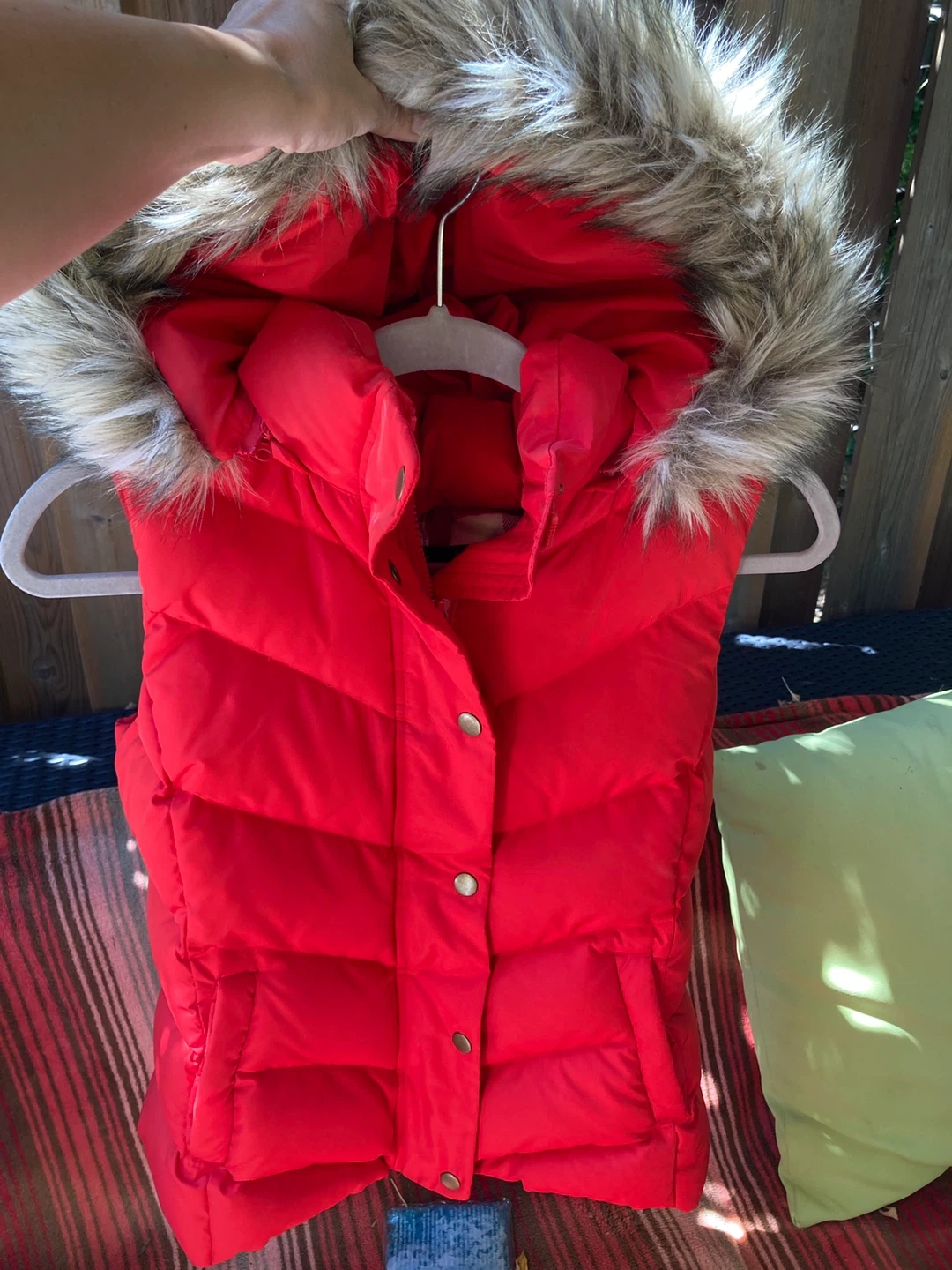 Lovely red Gap vest, size extra small (can also fit a size small) Filled with down for warmth. In excellent shape, never worn. No flaws. Has both a zipper and buttons. Faux fur trim on hood. Great deal! Cash only please. Pickup at Lululemon store, 2558 Yonge Street in midtown.
