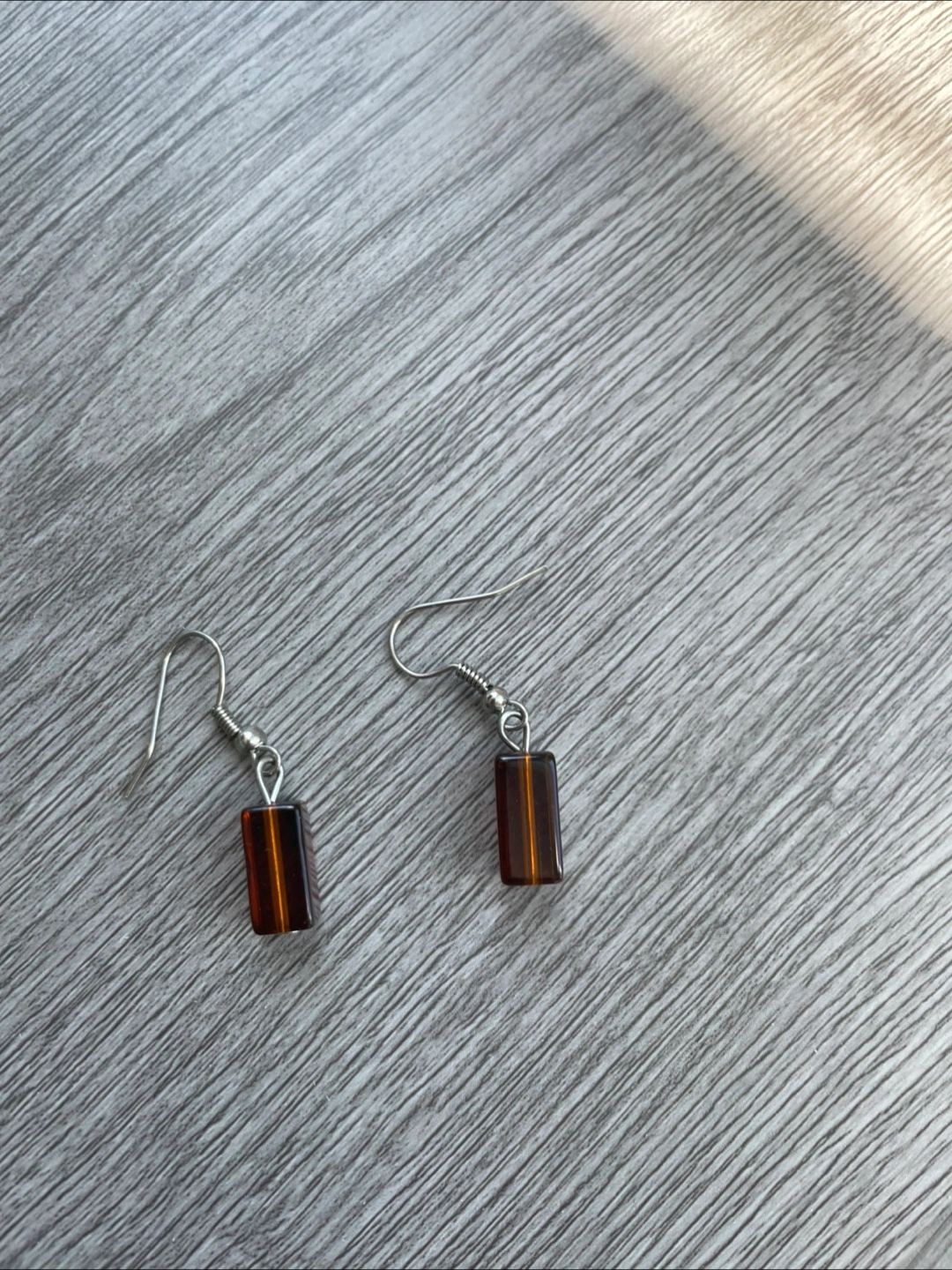 These are a pair of dangle earrings. They feature a silver hook and a small brown rectangle. They would be a great addition to your jewelry collection!