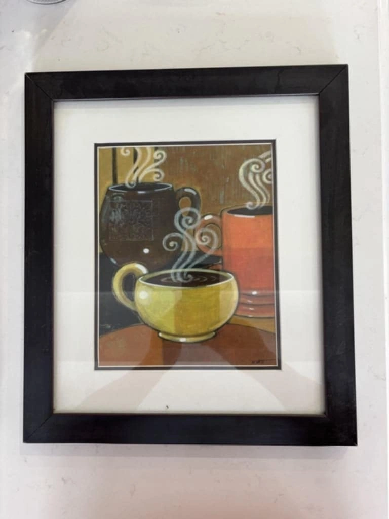 A framed print featuring colourful coffee cups. It would look great in a kitchen or dining area!