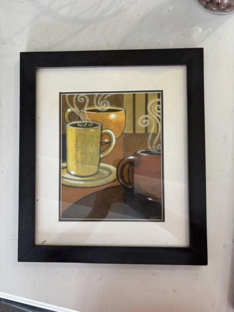 A framed print featuring a charming coffee cup design! The frame is a sleek black, adding a touch of modern style to the artwork. It would look great in a kitchen or dining area