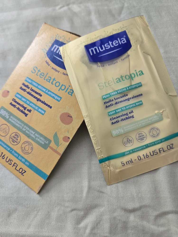 Selling a sample size (5ml - 0.16 US FL.OZ) of Mustela Stelatopia Cleansing Oil. It's designed for very dry to atopic skin and is anti-itching. It contains 98% ingredients of natural origin. Expiry Date: 2026 December 12. very nice aroma, easily cleans.