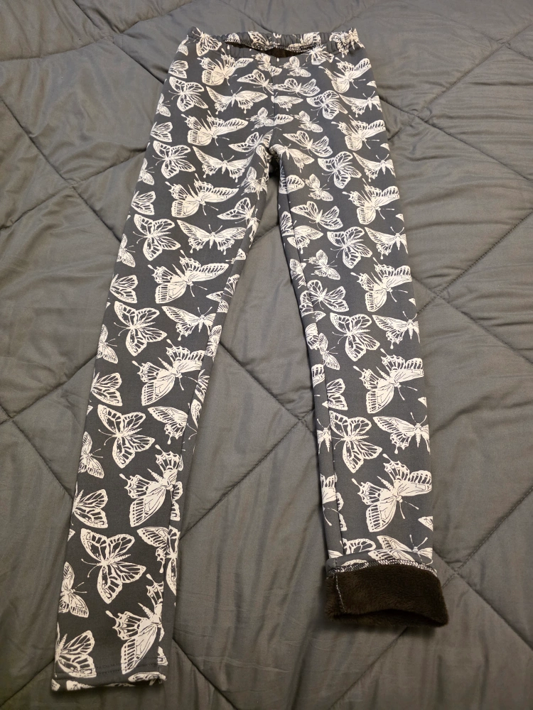 Snuggle up in these super comfy Just Cozy leggings! They're a size M/L and feature a cute butterfly pattern on a grey background. Inside, they're lined with a soft faux fur-lining, perfect for keeping you warm on chilly days. Made with 95% polyester and 5% spandex for a stretchy and comfortable fit