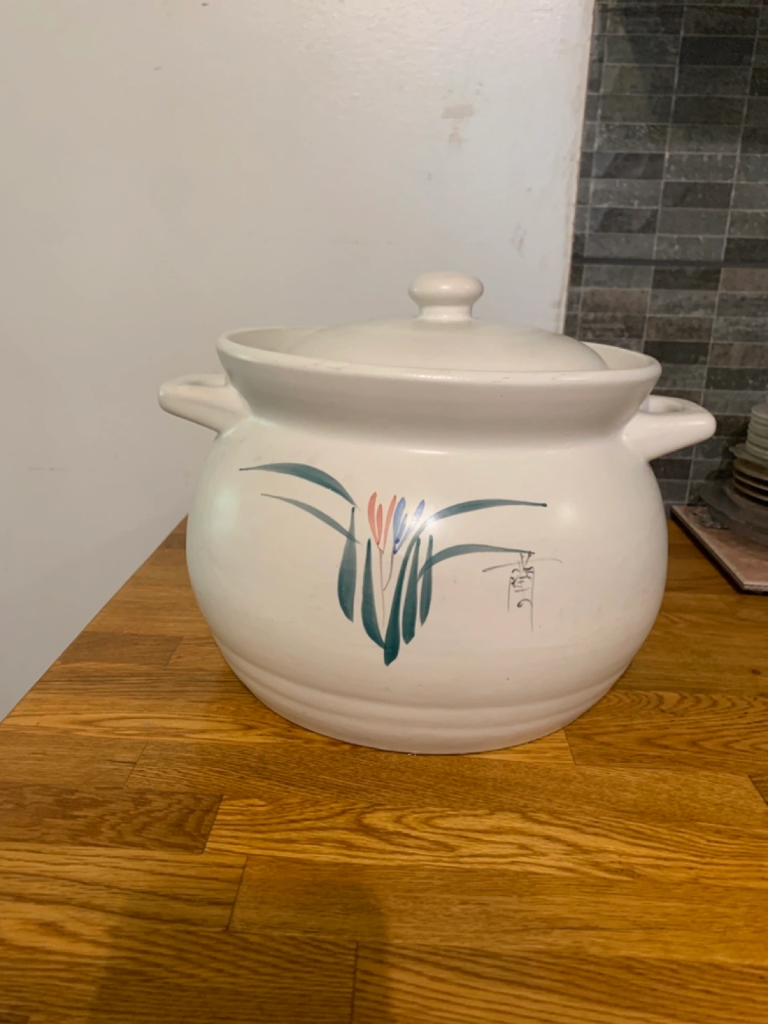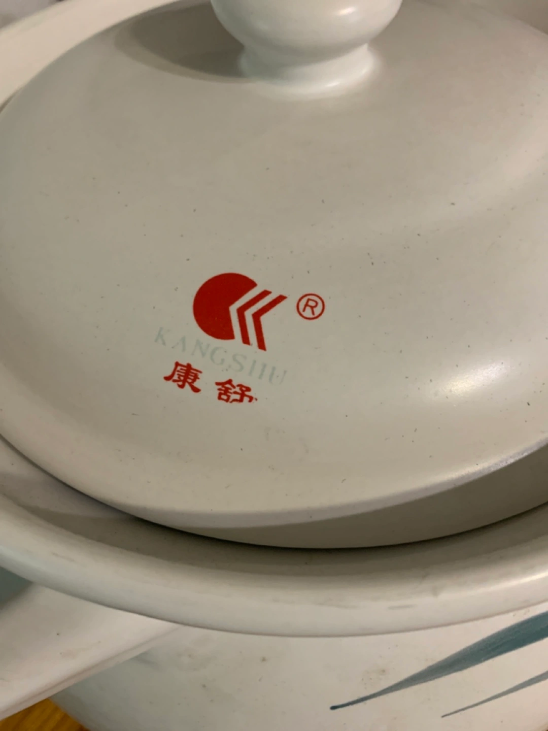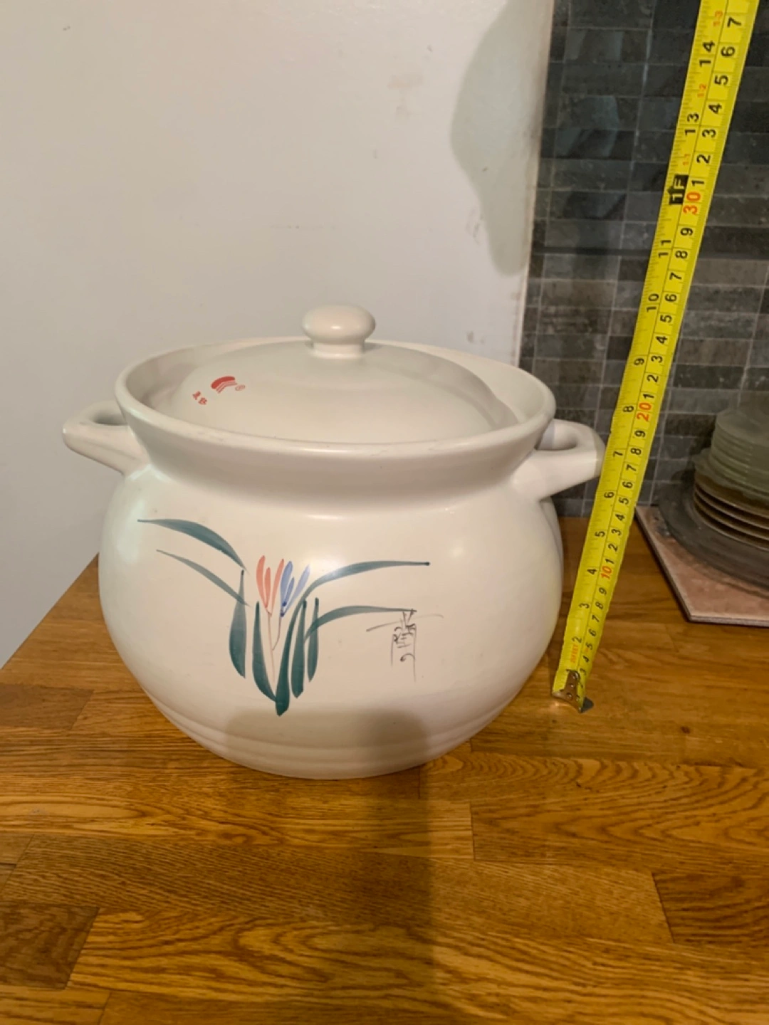 I'm selling a Kangshifu ceramic cooking pot. It's a lovely pot with a lid and handles, perfect for slow cooking or making soups and stews. It has a nice floral design on the side