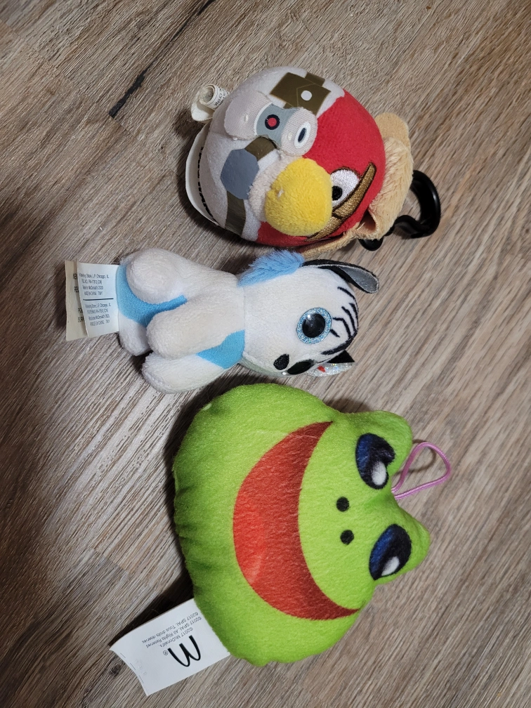 Collection of plush toys that include an Angry Birds character a frog McDonald's toy, a zebra, and a Ty penguin toy. They're in great condition and ready for a new home!