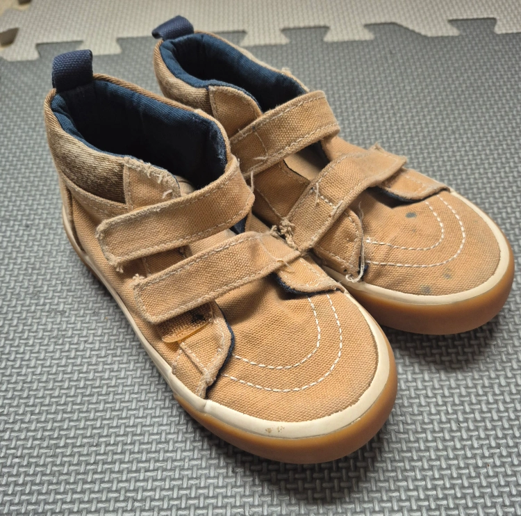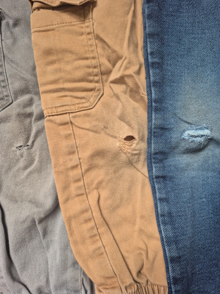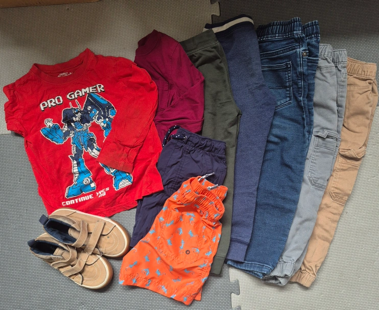 Bundle of kids' clothing including pants, 2 long-sleeve shirts, a pair of shorts and swim shorts, (size 3) and shoes, (size 10T). The pants are various styles and colours, including denim and cargo styles. The long-sleeve shirt is red with a graphic print. The shoes are tan-coloured high-tops with velcro straps (velcro is a little loose). Note the image of the 3 pants and shoes, theses have been well worn, but are still in wearable condition. Great for any kid who loves to move and get messy.