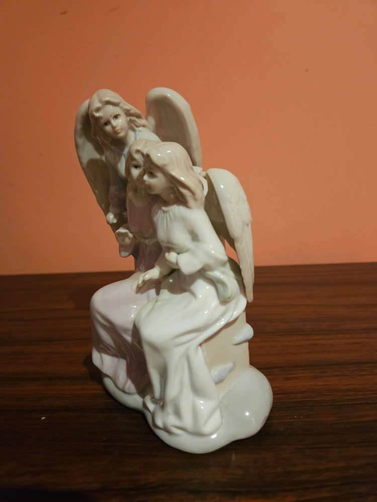 There are 2 guardian angels protecting the girl in the middle. This figurine was made by Russ Berrie and is part of the Marbella Collection. There are no scratches or nicks on the figurine, and the height of 6-1/2 inches is taken from the standing angel. CASH ONLY & CURBSIDE PICKUP