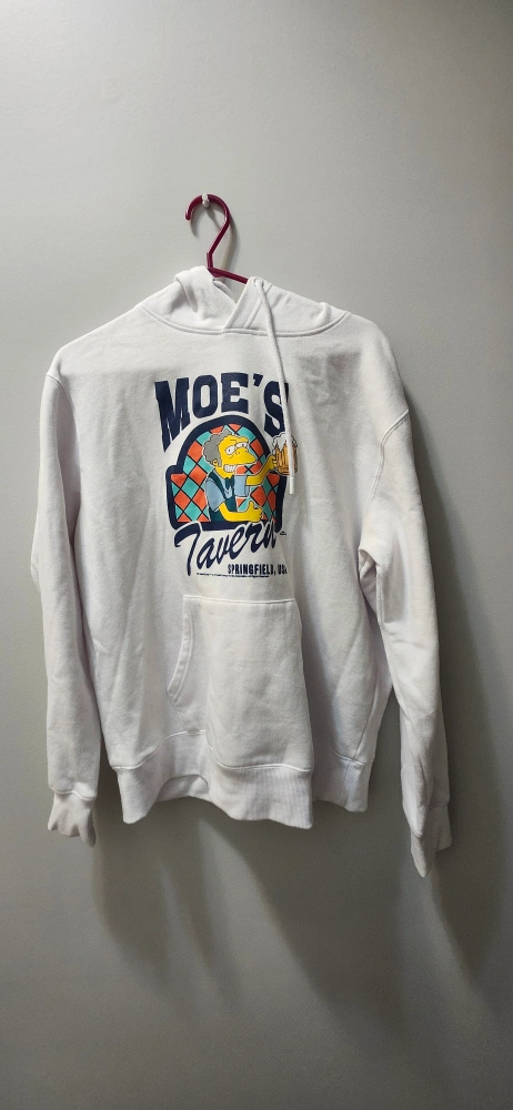 Selling a white Moe's Tavern hoodie in size M. It's made of 65% polyester and 35% cotton. Perfect for any Simpsons fan! moving Aug 30th need gone!