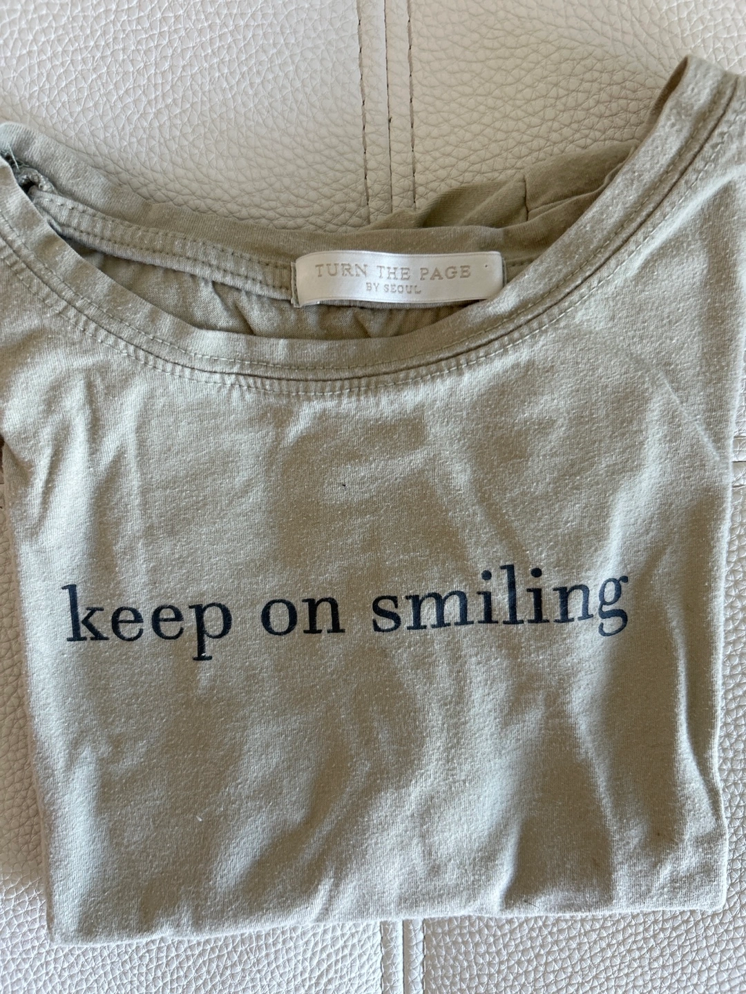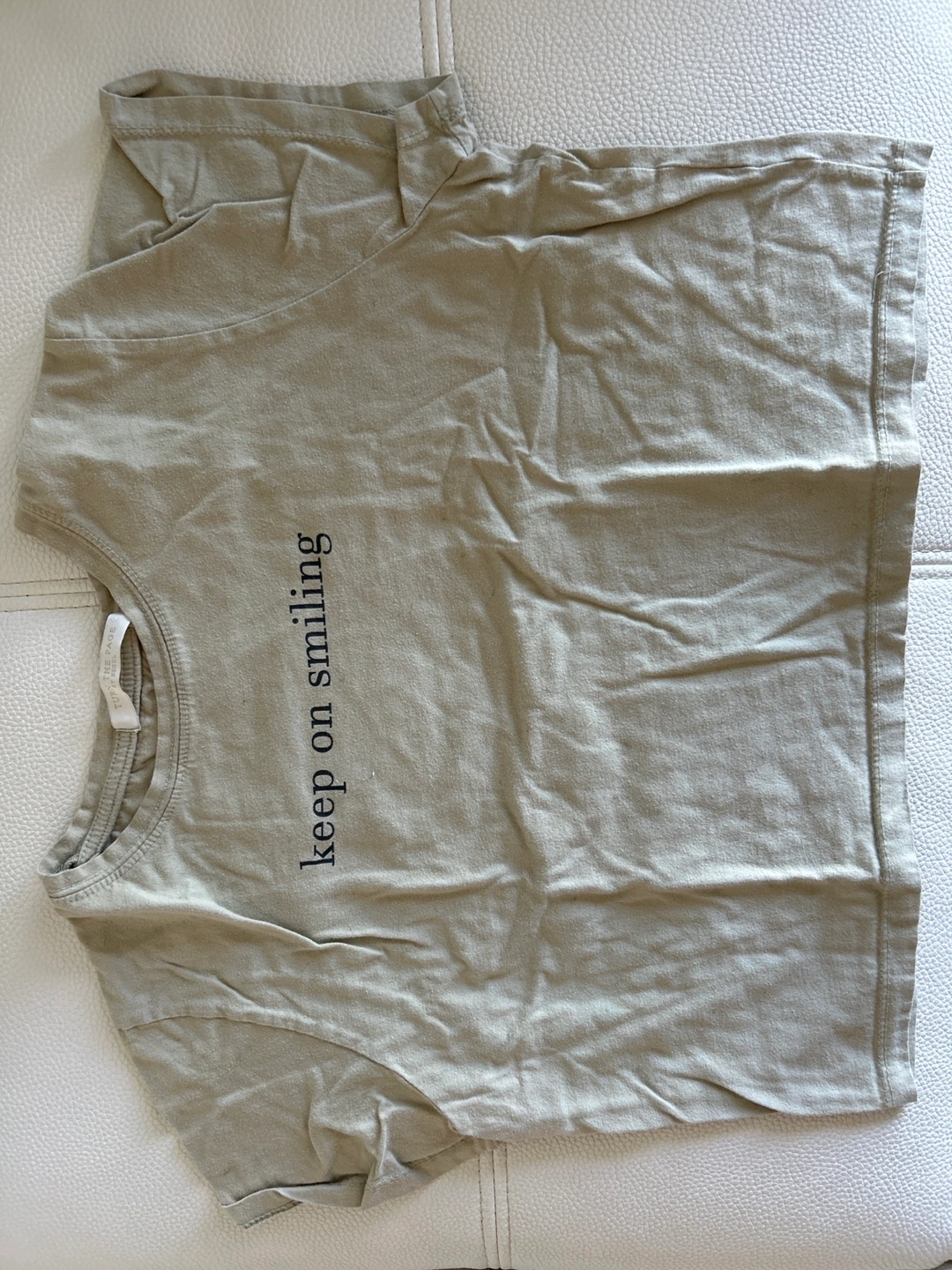 Cute T-shirt from Turn the Page with 'keep on smiling' printed on the front! Cropped fit It’s free Msg to schedule pickup