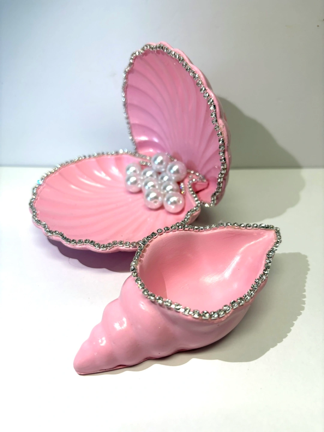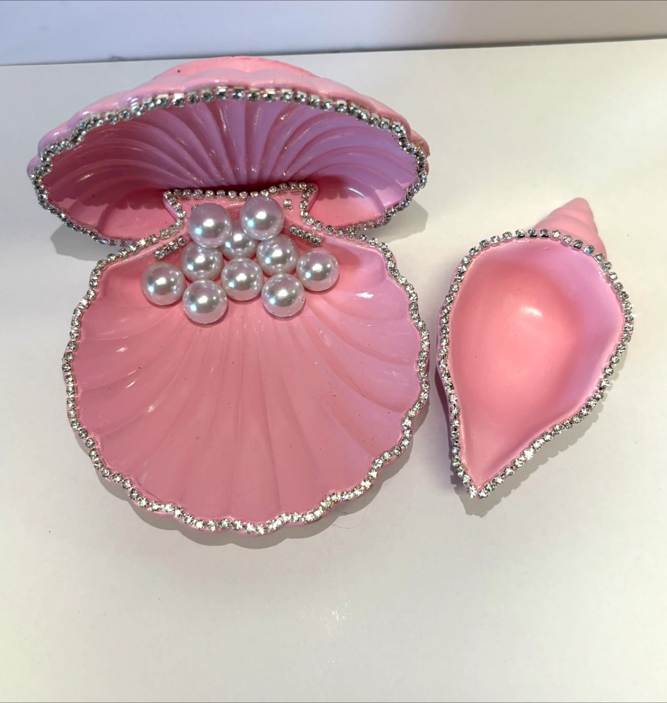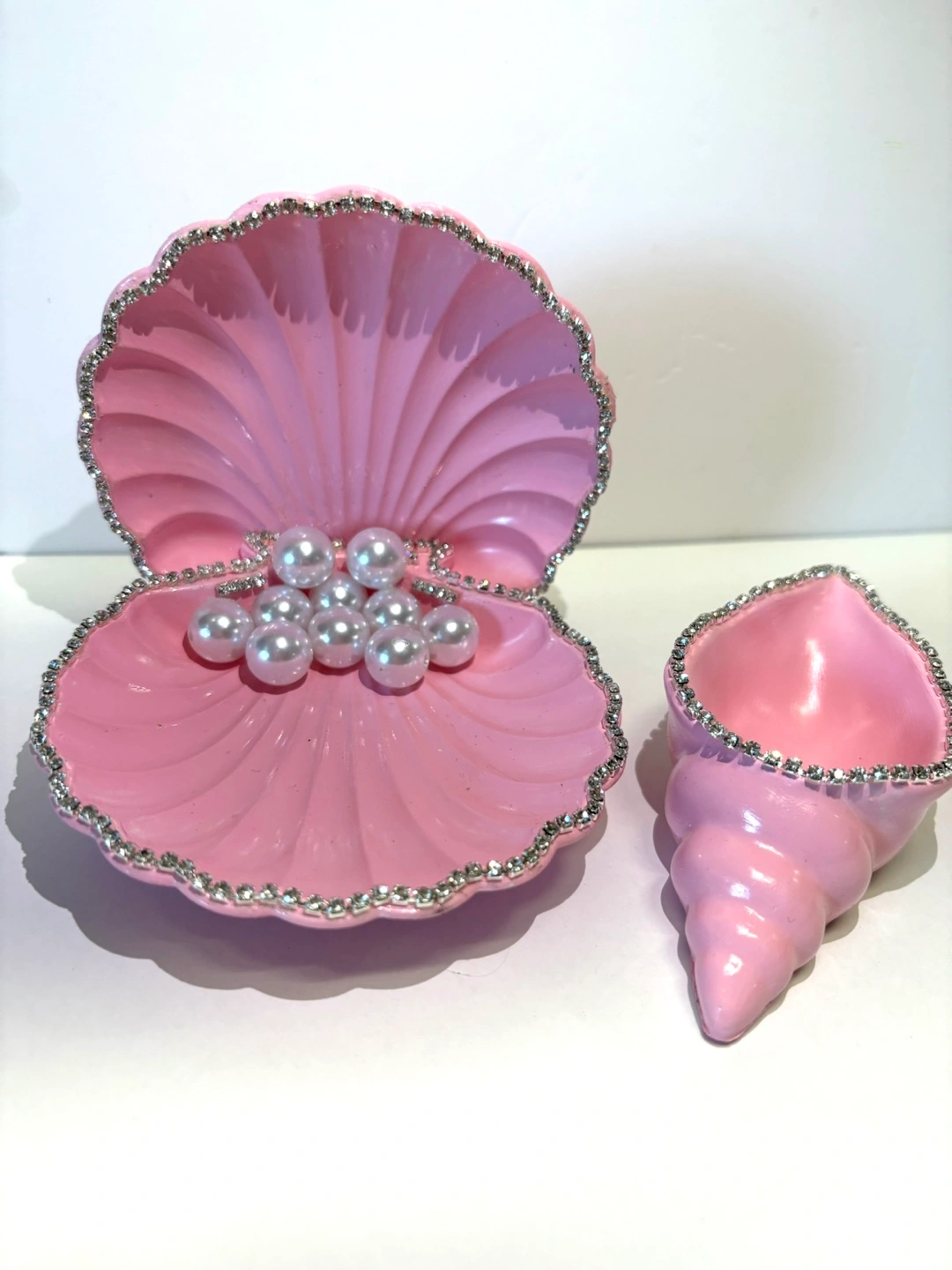 Bring a touch of the ocean to your home with this beautiful, handmade seashell dish set. Crafted from high-quality Jesmonite, this decorative piece captures the enchanting spirit of the sea. The set includes two unique shells: a stunning scallop shell that opens to reveal a cluster of faux pearls, and a graceful spiral conch shell. Both pieces feature a delicate, hand-painted light pink finish and are adorned with a border of sparkling rhinestones and silver leafing, adding a touch of elegant bling. This versatile set can serve as a functional trinket dish for rings, earrings, or small treasures, a catch-all tray on your entryway table. It’s also a perfect decorative accent for a bedroom vanity, living room shelf, or any space that needs a little coastal charm. This Jesmonite seashell set is a perfect gift for mermaid lovers, coastal enthusiasts, or anyone who appreciates unique, handmade home decor. Due to the handmade nature of these items, each one is truly unique and may have slight variations in color and texture, which adds to its one-of-a-kind charm.